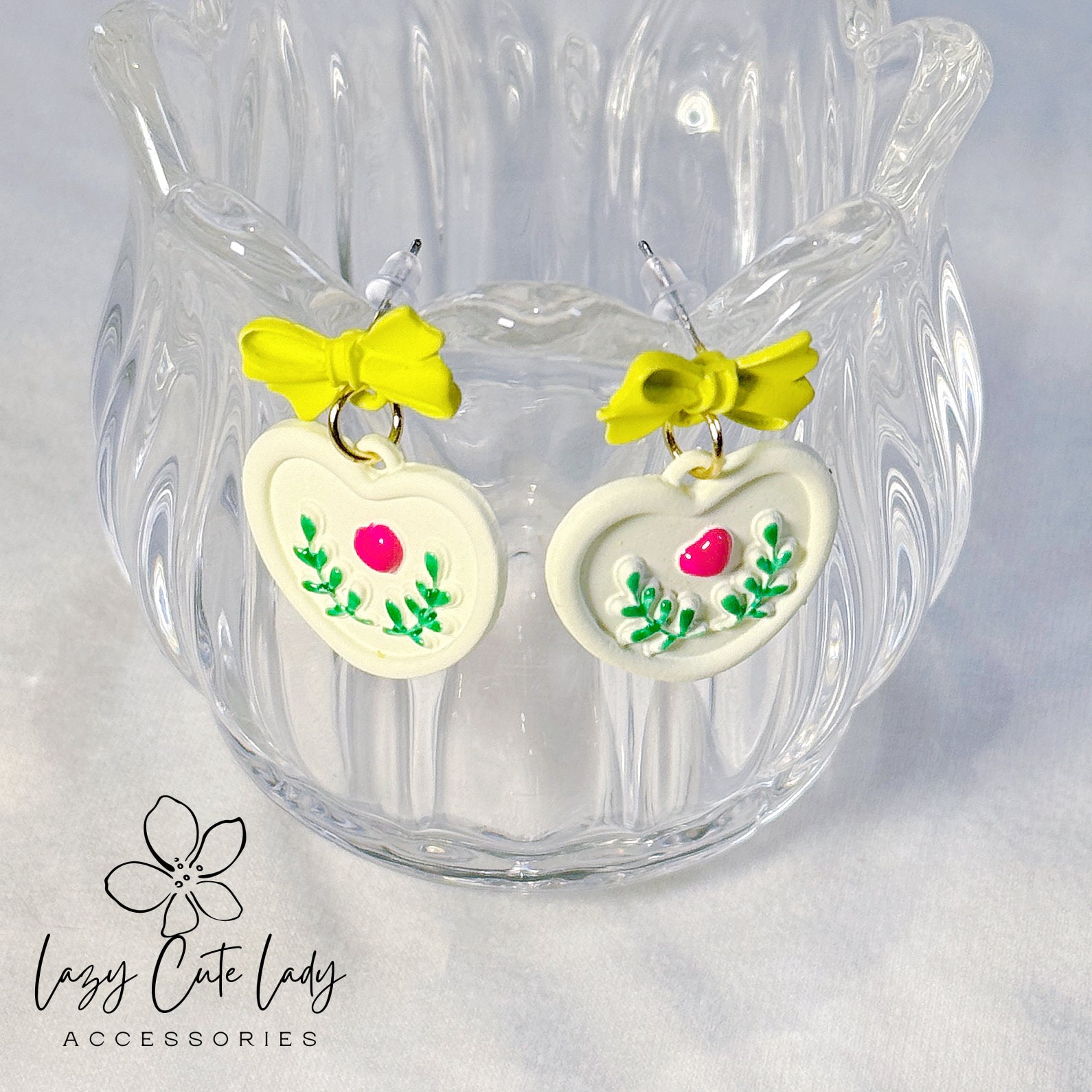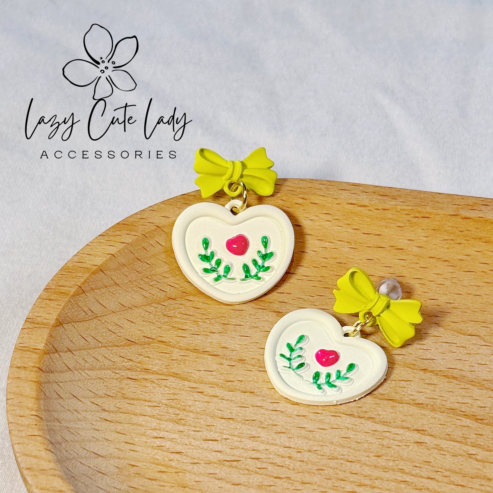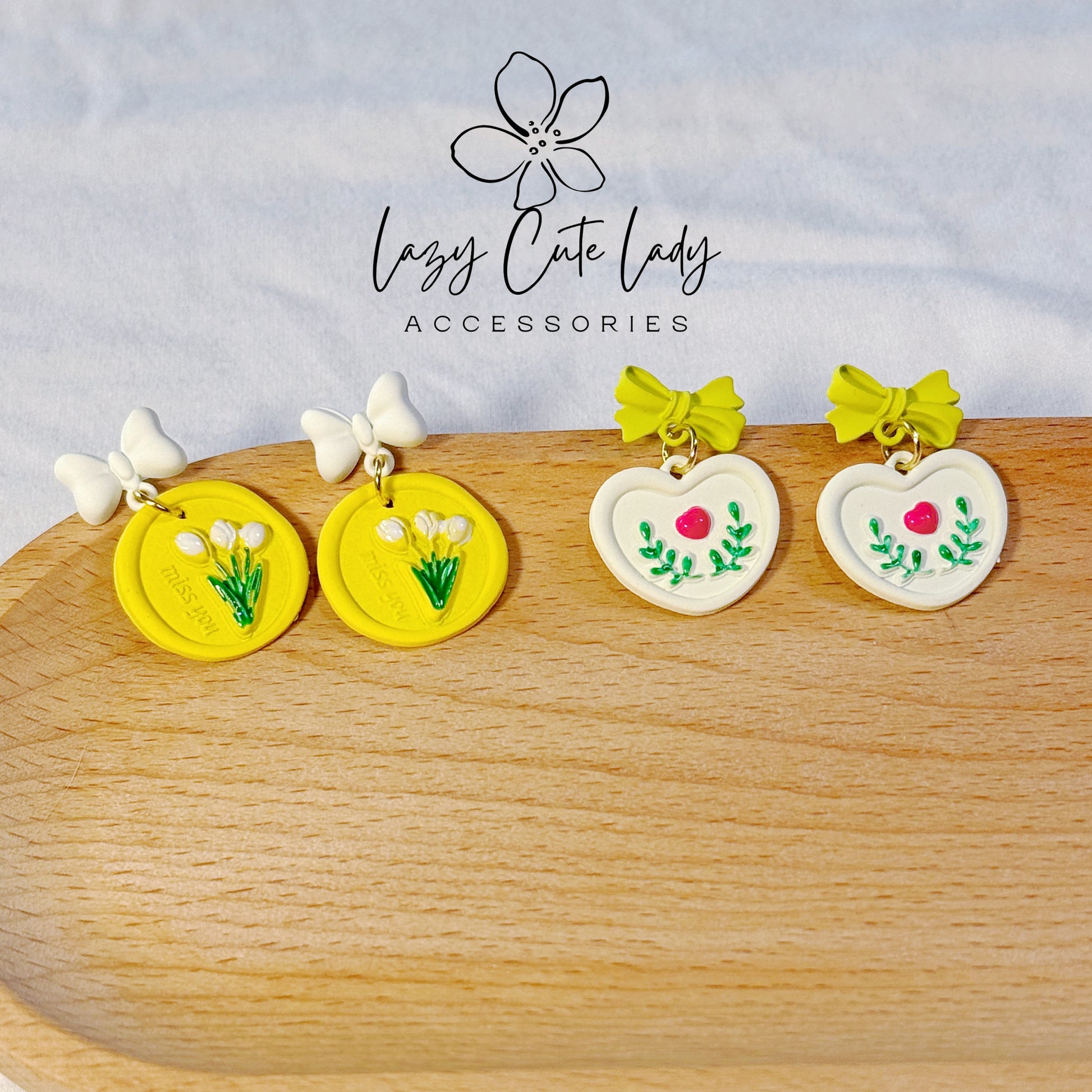 Introducing our charming earrings featuring bow motifs and floral designs, available in two delightful color options: white bows with tulip designs and yellow bows with leaf motifs, the latter adorned with pink heart accents for an extra touch of cuteness. Both pairs of earrings are perfect for spring and summer wear, exuding delicacy and a natural charm. The color combinations are harmonious, making them suitable for daily wear and ideal for vacation outfits. Versatile enough for various occasions and age groups, these earrings complement a wide range of clothing styles effortlessly. Crafted with silver ear posts, they are also suitable for individuals with metal sensitivities. An excellent choice for gifting occasions.