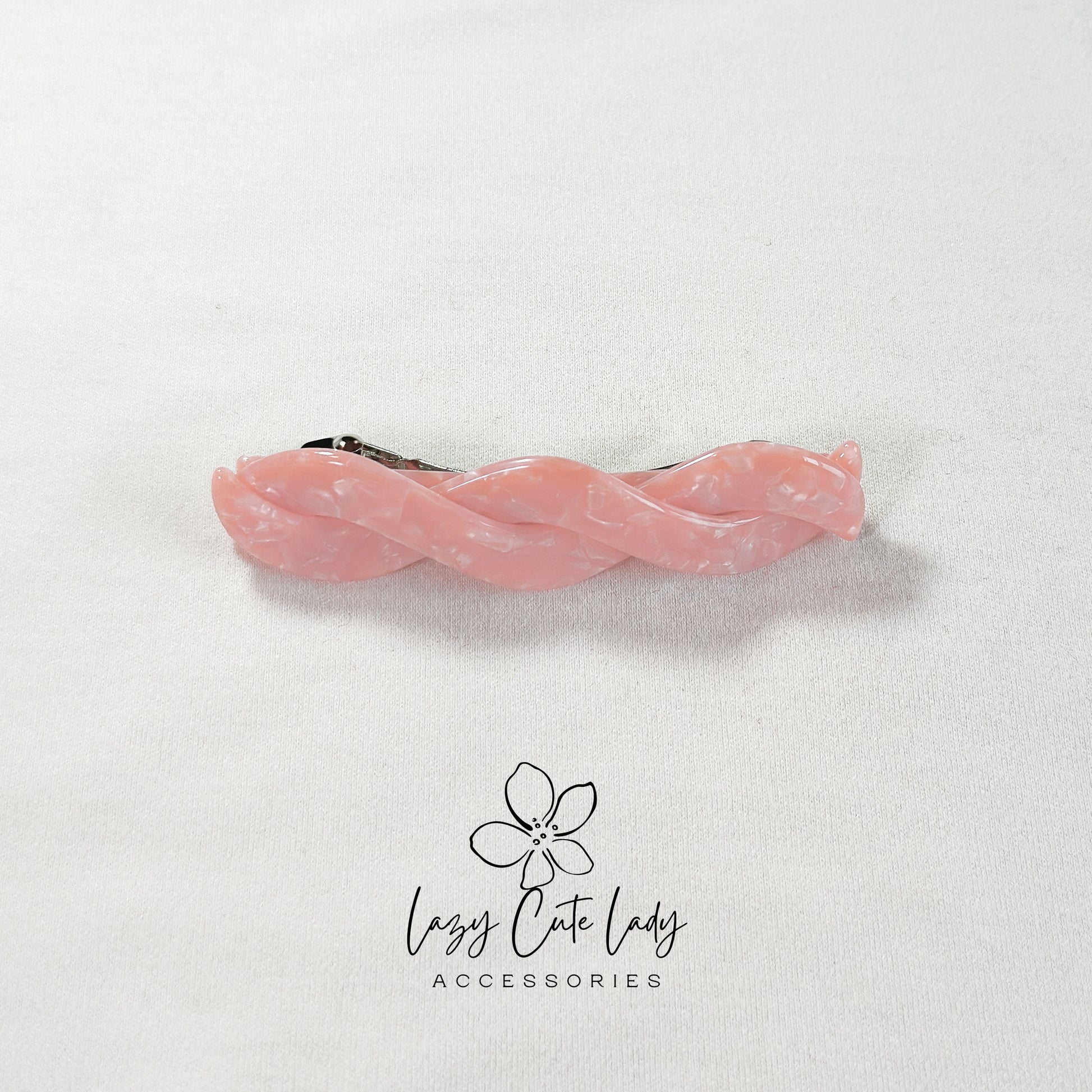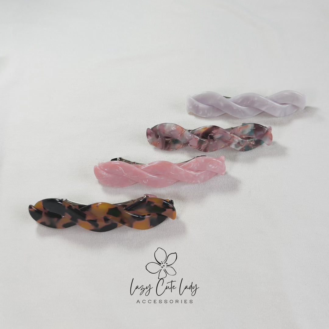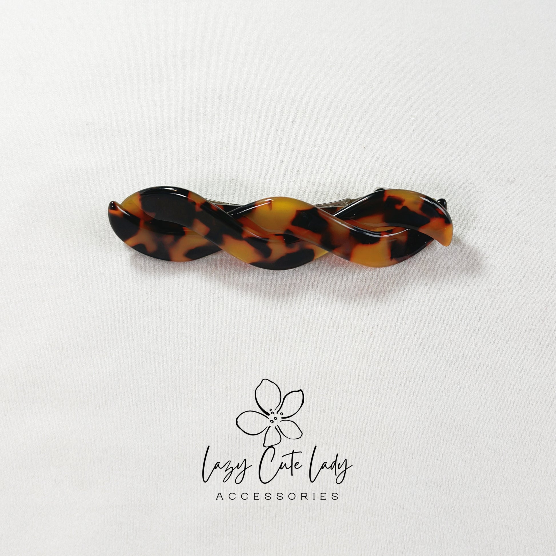 Introducing our Braided Elegance Hair Clip, a medium-sized accessory measuring 3.5 inches. This clip features a braided design that exudes a sense of timeless simplicity and fashion-forward elegance. With its chic and understated style, it's the perfect choice to complement various outfits for any occasion. Available in four color options – Tortoiseshell Brown, Gemstone White, Floral Pink, and Floral Brown – this clip adds a touch of sophistication to your hairstyle. Crafted with environmentally friendly vinegar-acetate board material, it seamlessly combines style with eco-conscious craftsmanship.
