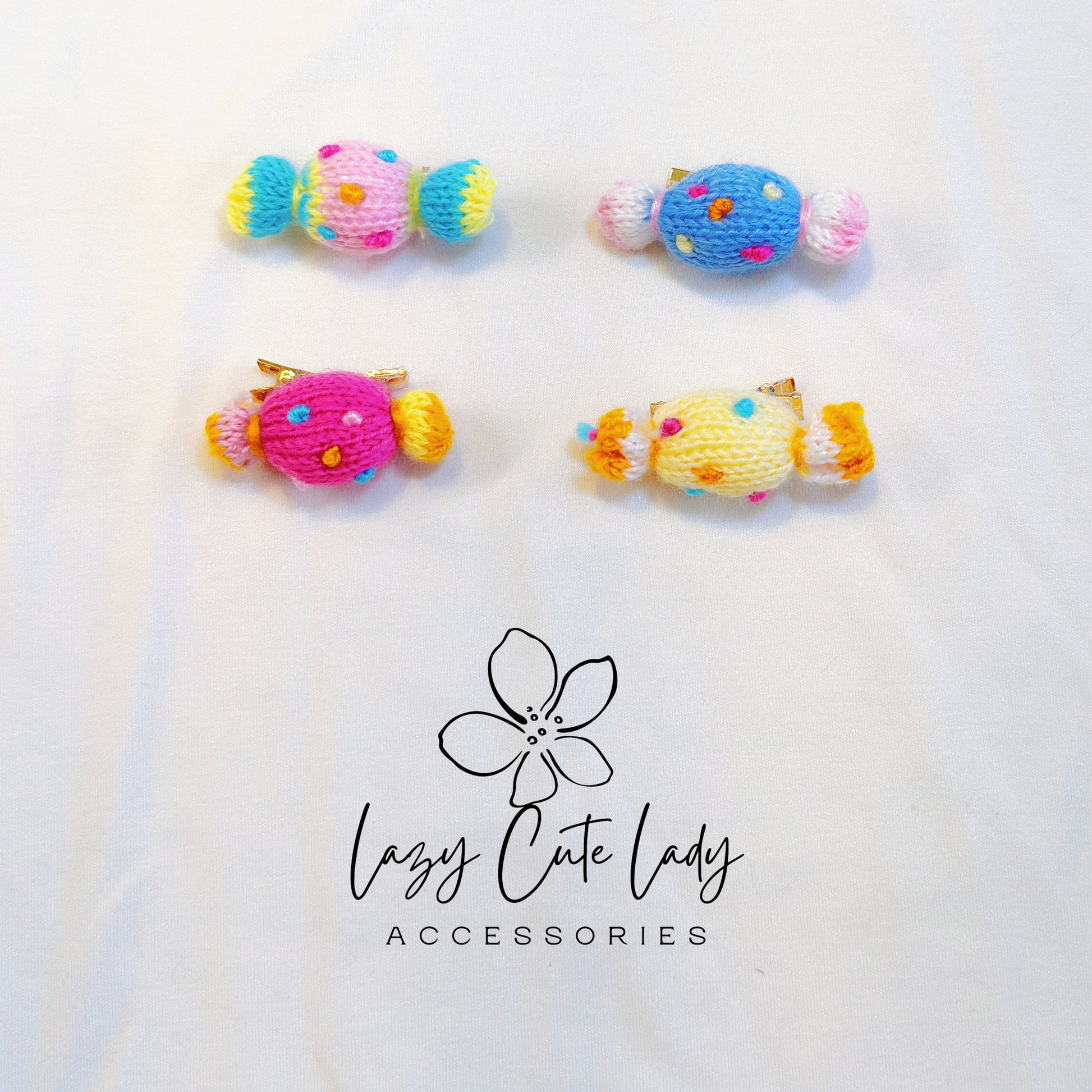 Add a playful pop of color to your hairstyle with our Candyland Knitted Hair Accessories! Handcrafted from soft, vibrant yarn, each piece is shaped like a wrapped candy with colorful "sprinkles" and adorable textures.