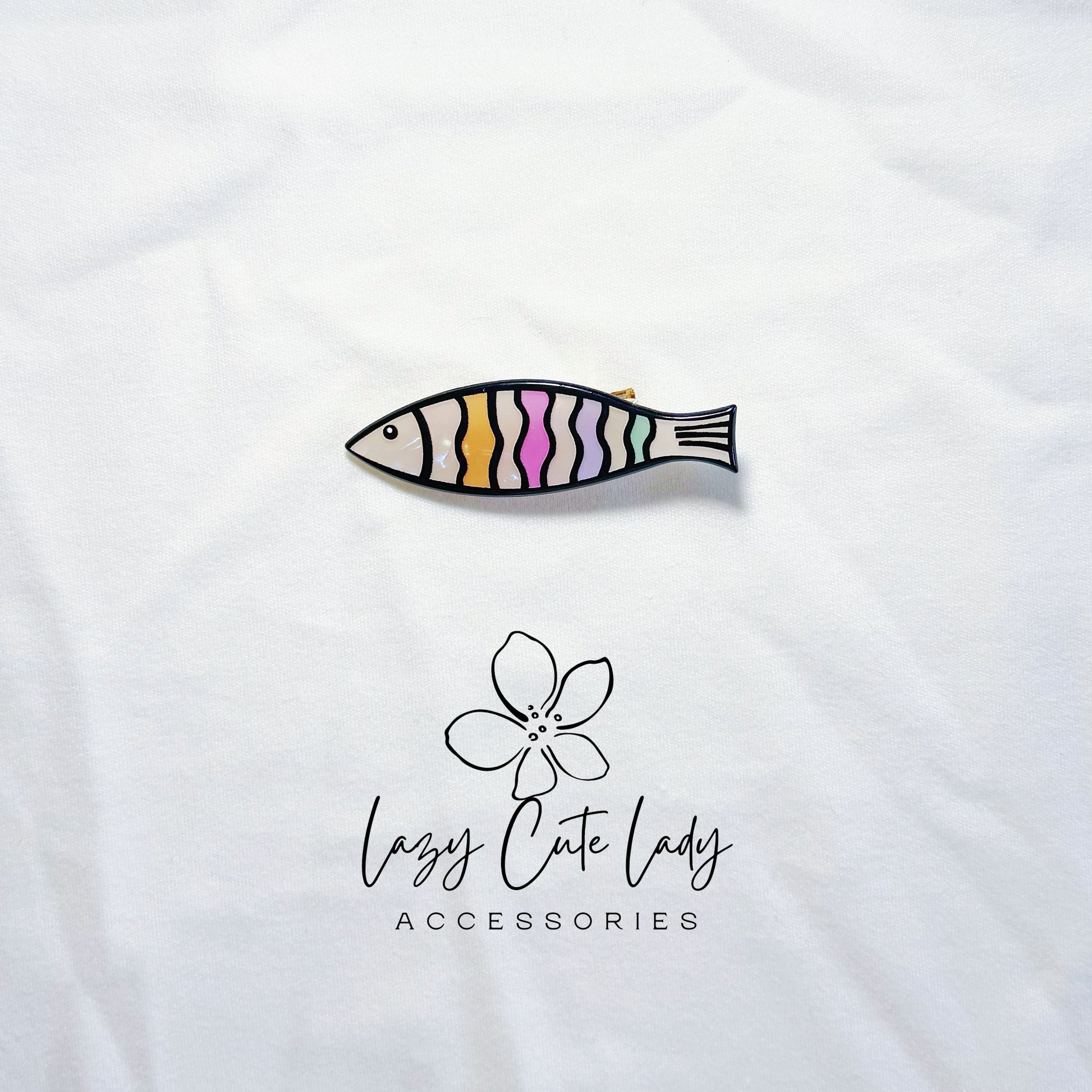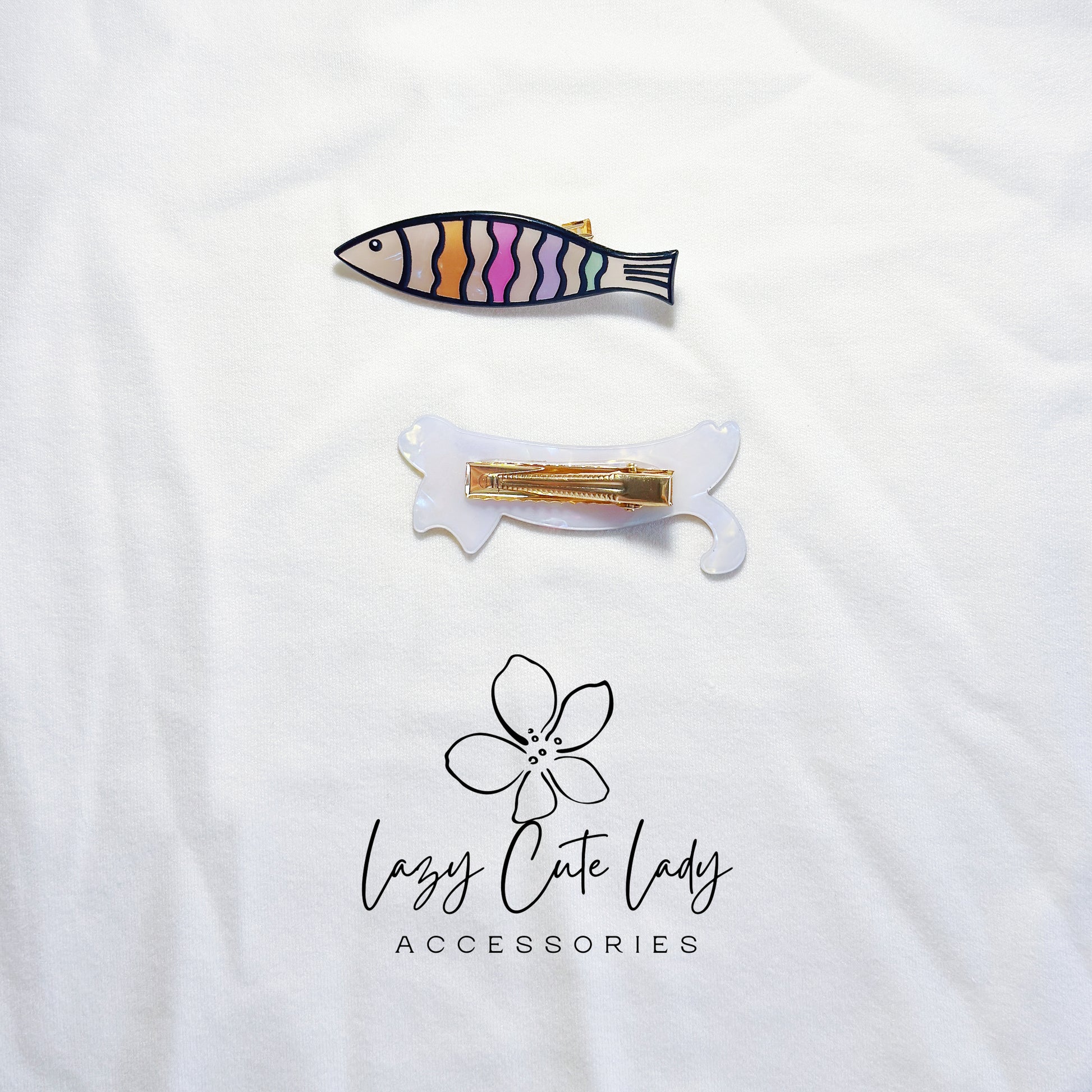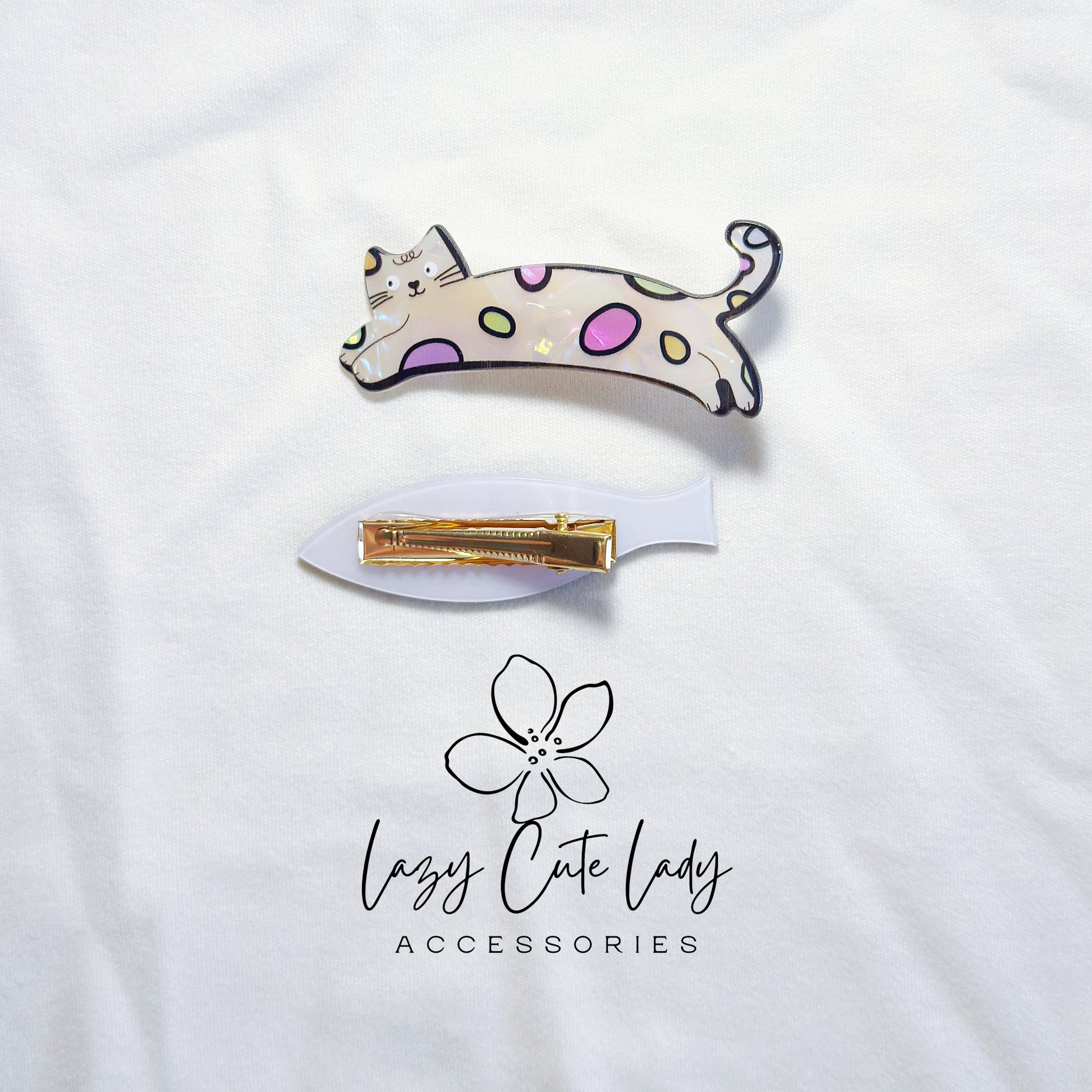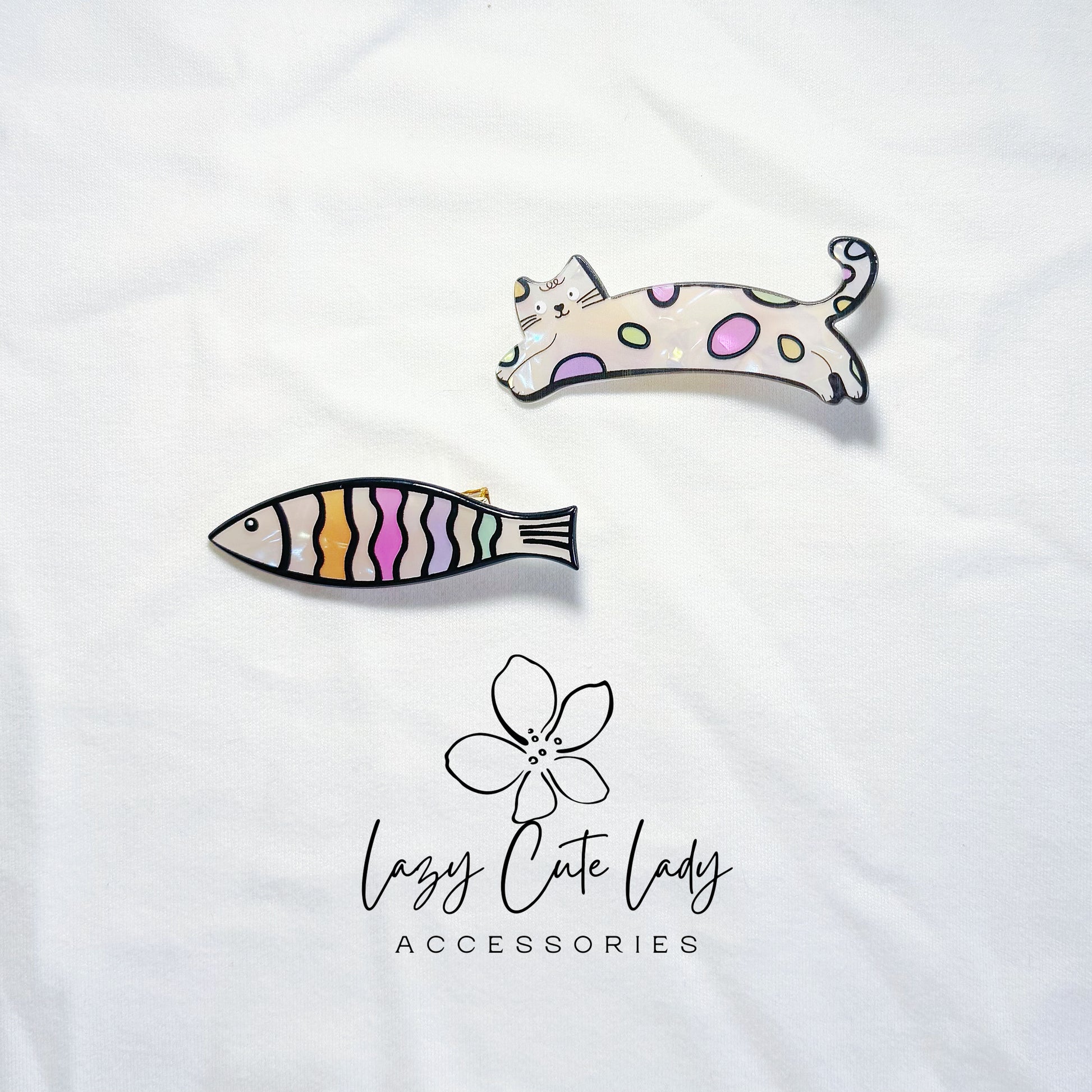 Cat & Fish Acrylic Hair Clips – Lazy Cat Rainbow Fish Barrettes | 2 Styles- Cute hairClips- Gift for Her
