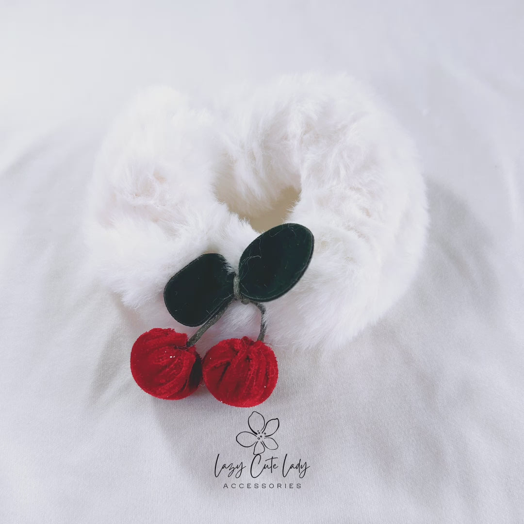 Cute Plush White Fabric Hair Scrunchie with Red Cherry Accents- Hair Accessory- hair Tie- for girl for women- gift