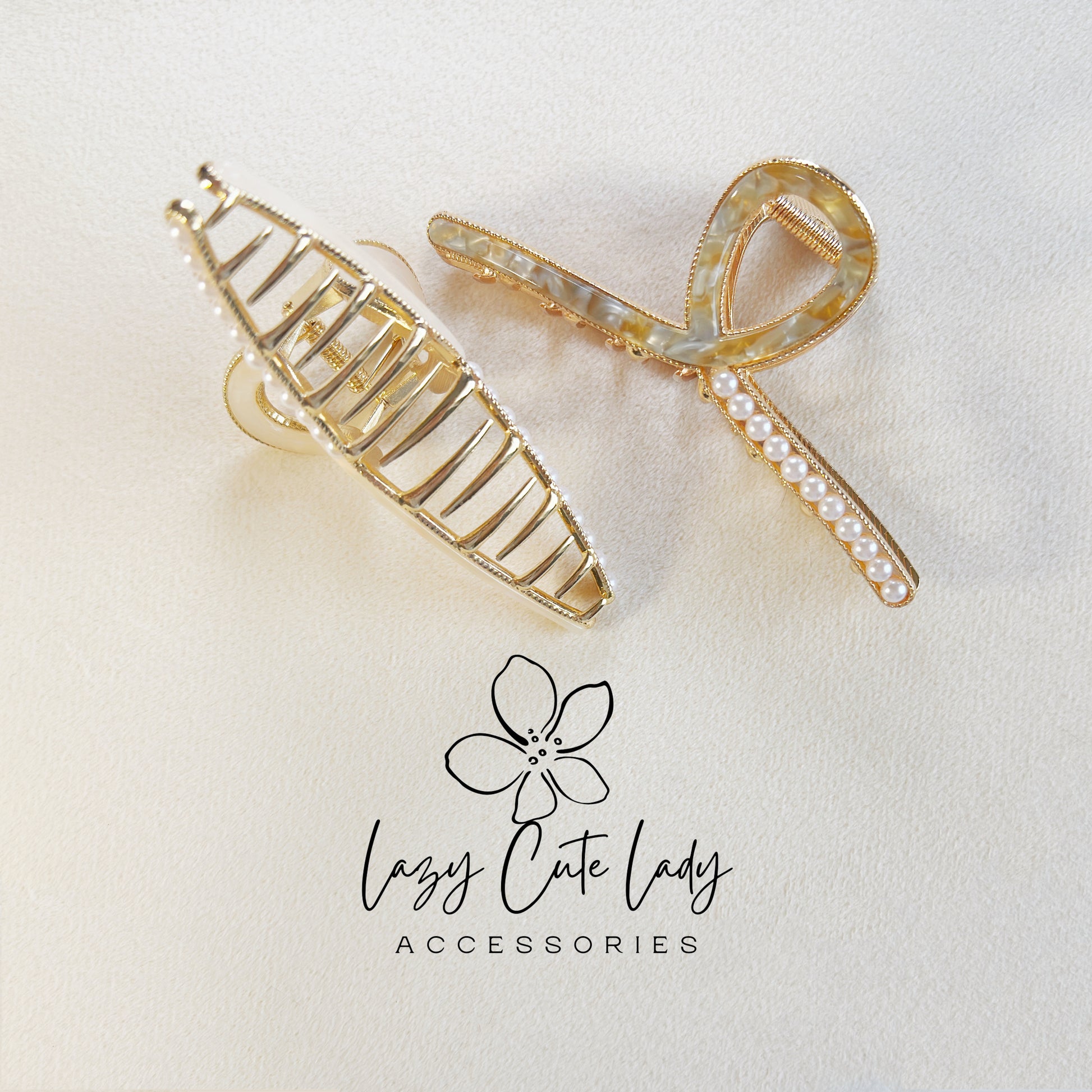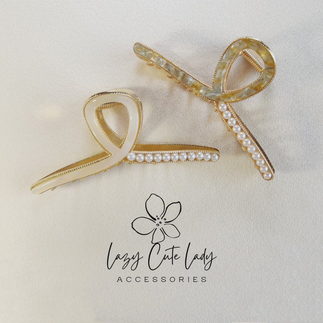 Elegant Pearl-Accent Crossed Ribbon Hair Claw – Eco-Friendly Acetate and Metal Design-pearl accents