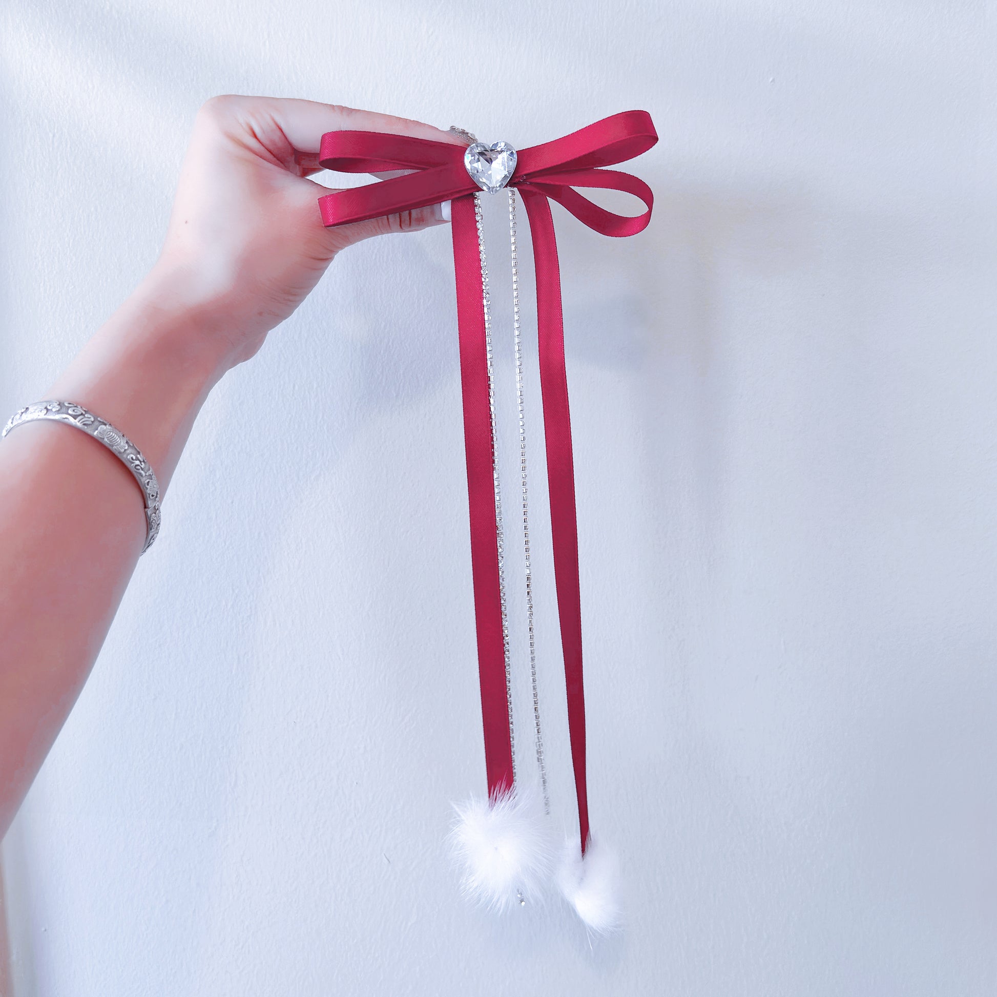 Introducing our Elegant Ribbon and Rhinestone Butterfly Bow Hair Accessory, a charming addition to your hairstyle. This accessory features a delightful combination of long ribbons and a chain of sparkling rhinestones, creating a look that is both cute and elegant. Suitable for individuals of all ages, this accessory exudes a sense of design, imparting a gentle and playful touch. Available in two timeless colors, red and black, with a length of 5 inches.