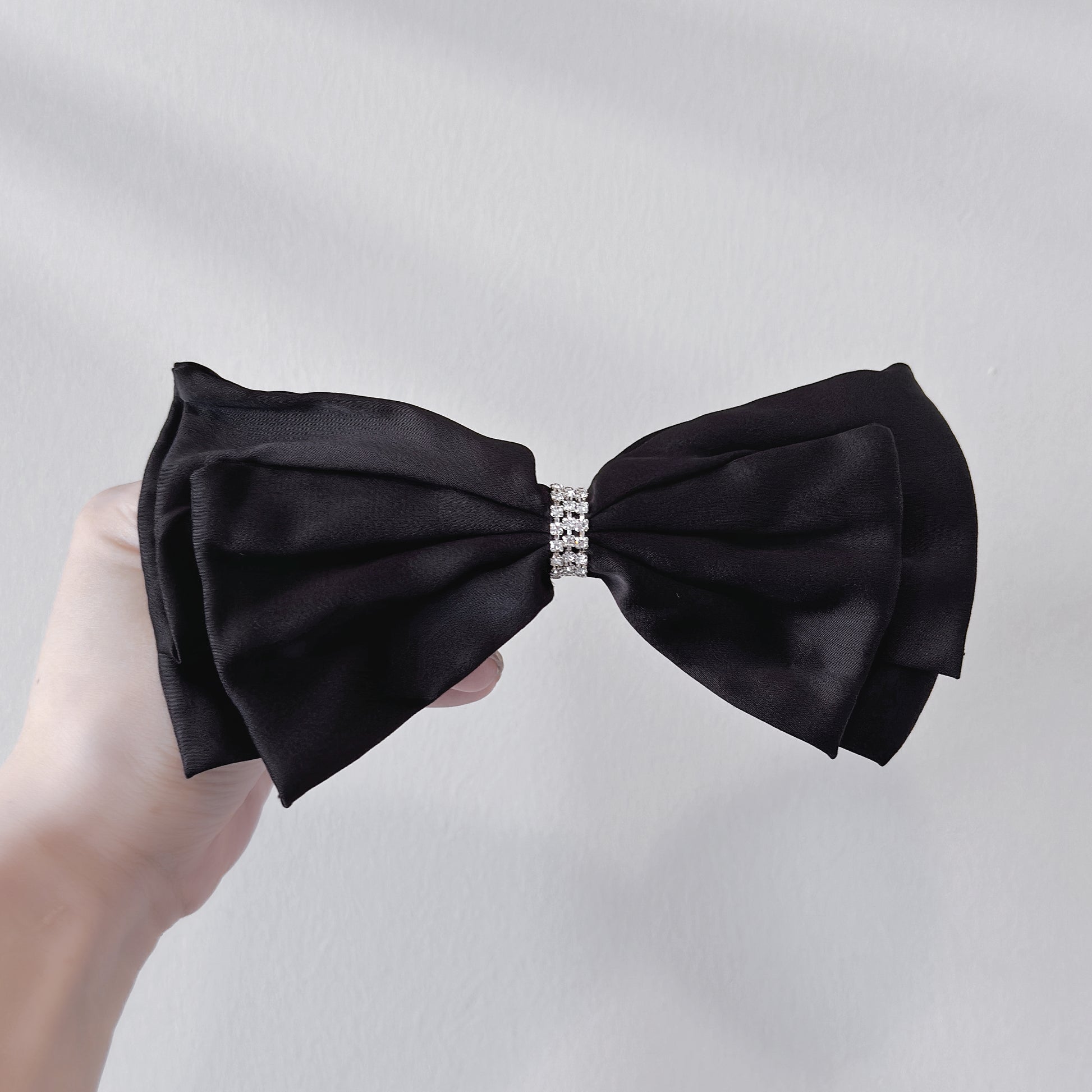 - The large satin ribbon bow, adorned with rhinestones, adds a touch of chic elegance to your hairstyle.