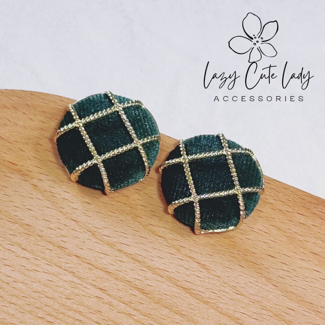 Introducing our exquisite green velvet round stud earrings, adorned with delicate gold metal mesh detail. The lush green velvet texture combined with the gold mesh creates a sophisticated look. The harmonious combination of dark green and gold exudes elegance and vintage charm, making these earrings perfect for both formal occasions and daily wear. Suitable for all occasions and age groups, they effortlessly complement various outfits. Crafted with silver ear posts, these earrings are also suitable for individuals with metal sensitivities. An ideal gift choice for any occasion.