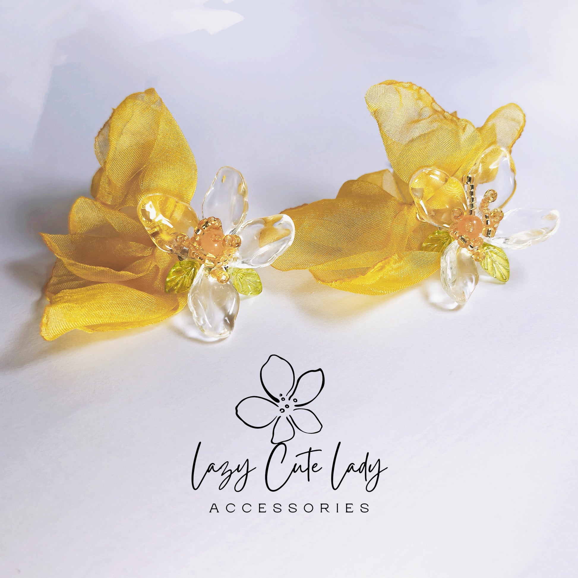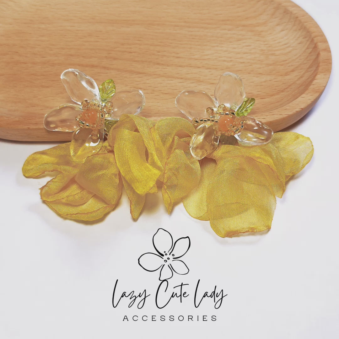 Elevate your look with our Fabric and Acrylic Flower Drop Earrings. Featuring a stunning combination of vibrant yellow fabric flowers and clear acrylic blossoms, these earrings are both beautiful and elegant. The acrylic flowers are intricately detailed with beaded centers, adding an exquisite touch to the design. These earrings are perfect for any occasion, seamlessly complementing both casual and formal attire. Their eye-catching yellow hue will enhance your outfit, making them suitable for all ages and a versatile addition to any wardrobe. They also make a wonderful gift. The earring posts are made from silver, ensuring they are hypoallergenic and perfect for those with metal sensitivities.
