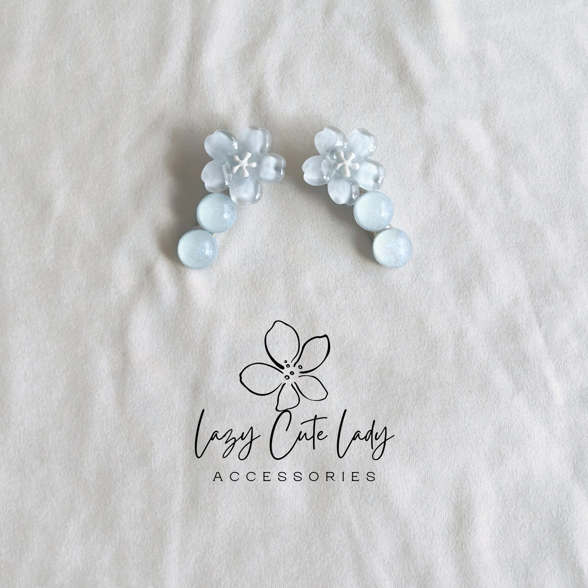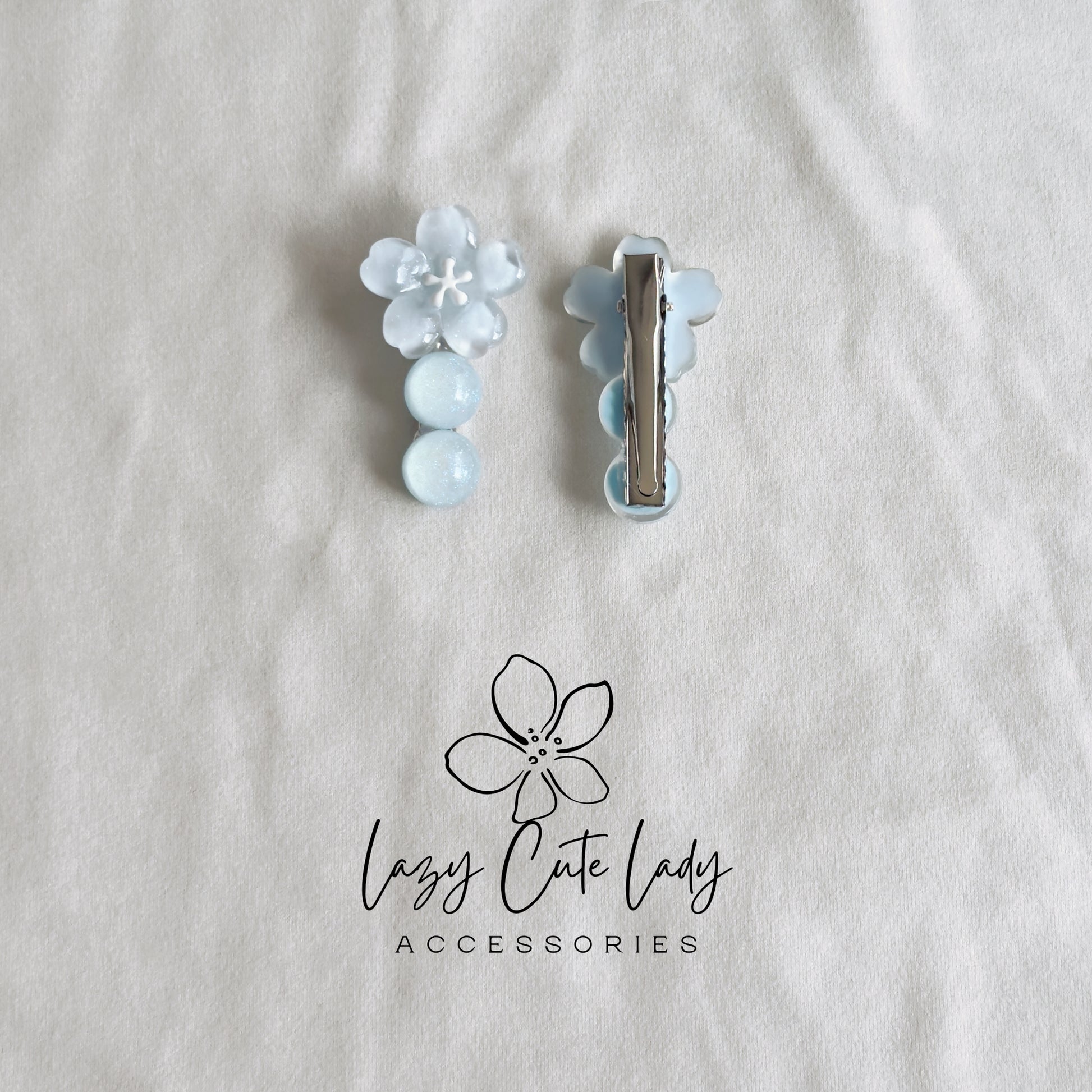 These dreamy frosted blue floral hair clips bring a gentle, elegant charm to any hairstyle. Each clip features a delicate layered blossom paired with three shimmering beads that resemble frozen dewdrops — creating a fairy-tale winter aesthetic.