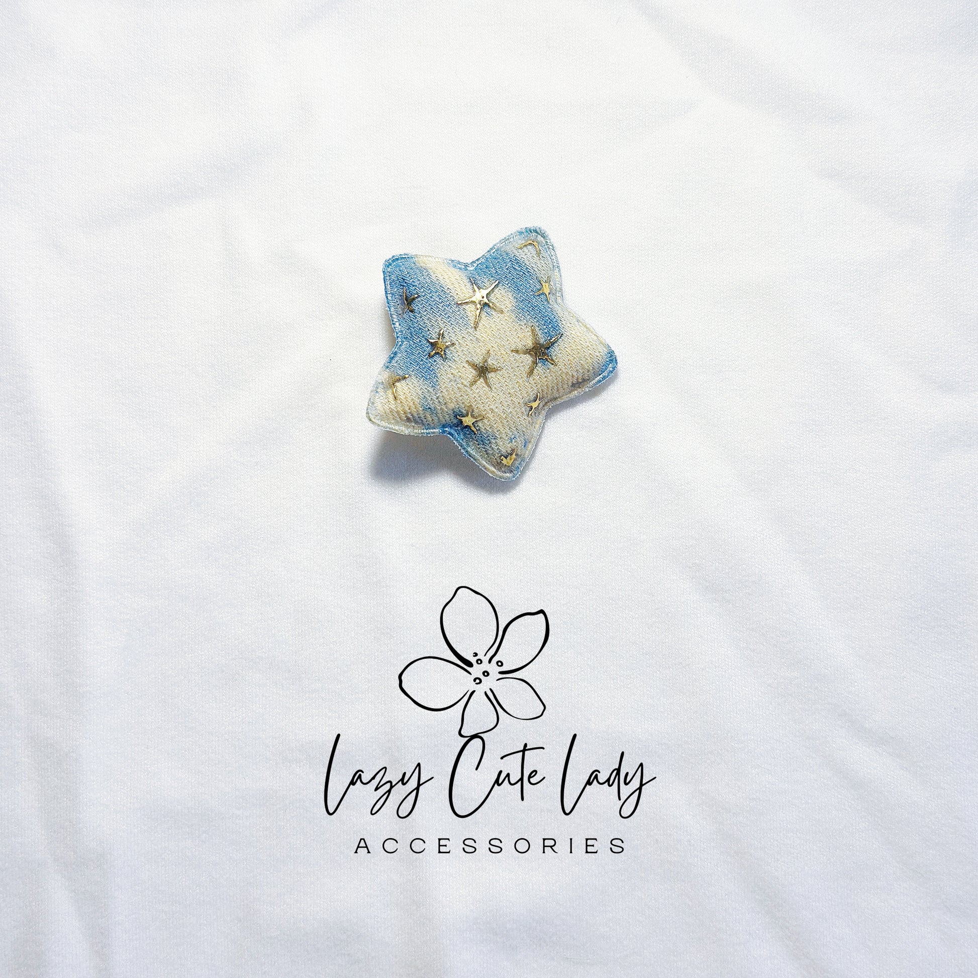 Shine like the night sky with our Galaxy Star Hair Clips! Featuring soft denim and dreamy tie-dye fabrics in deep navy, sky blue, and cloud-like swirls, each star is sprinkled with shimmering gold foil stars for an extra magical touch.