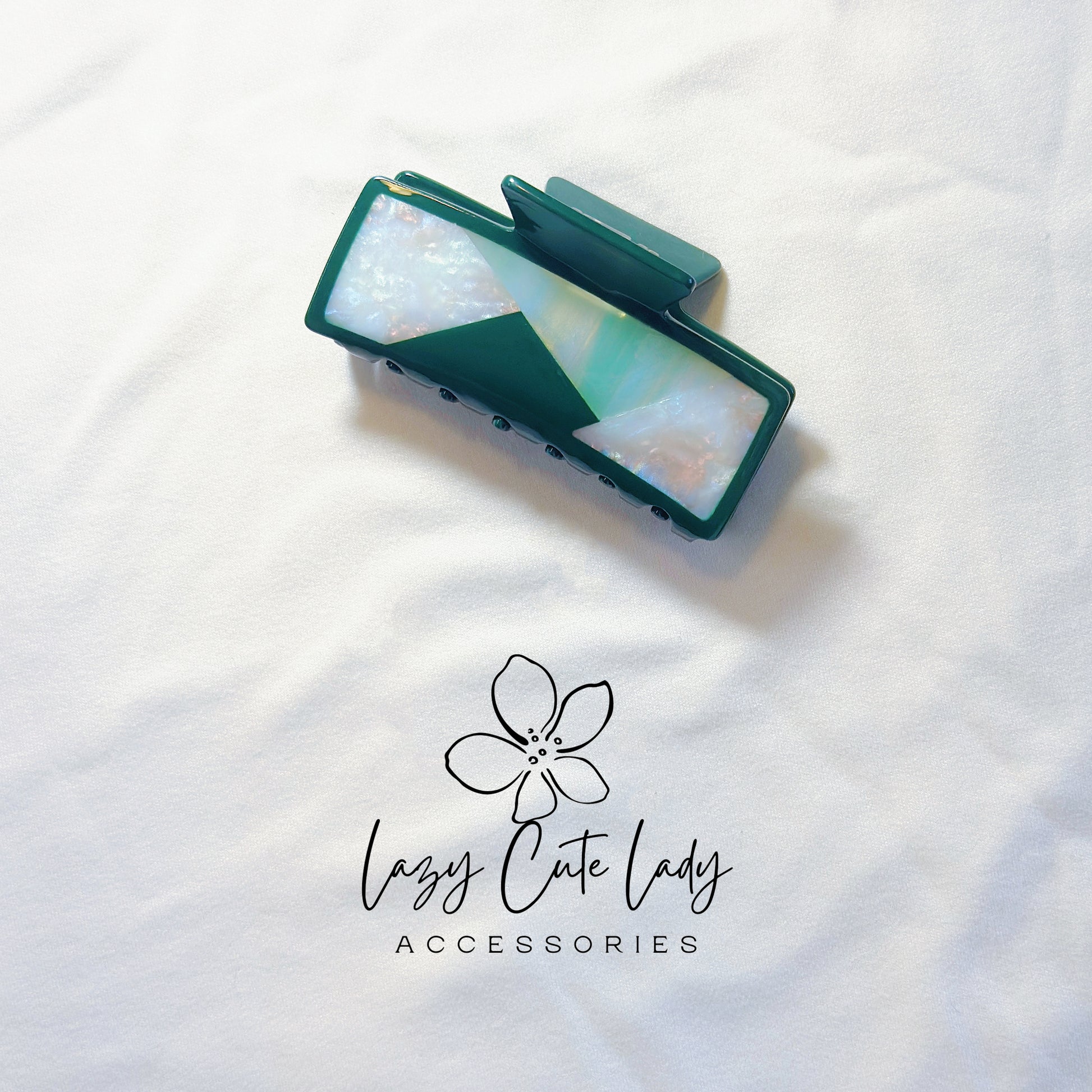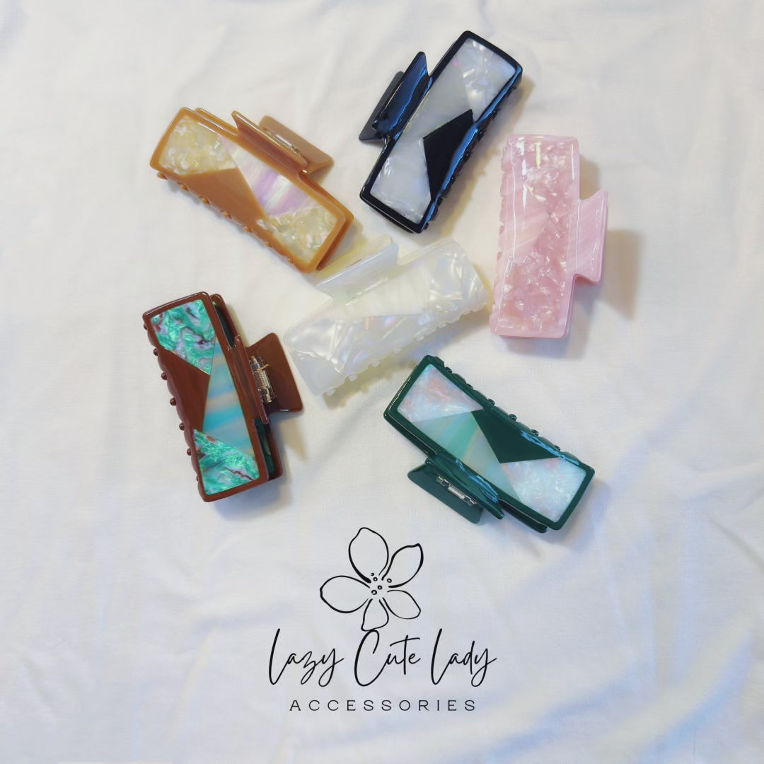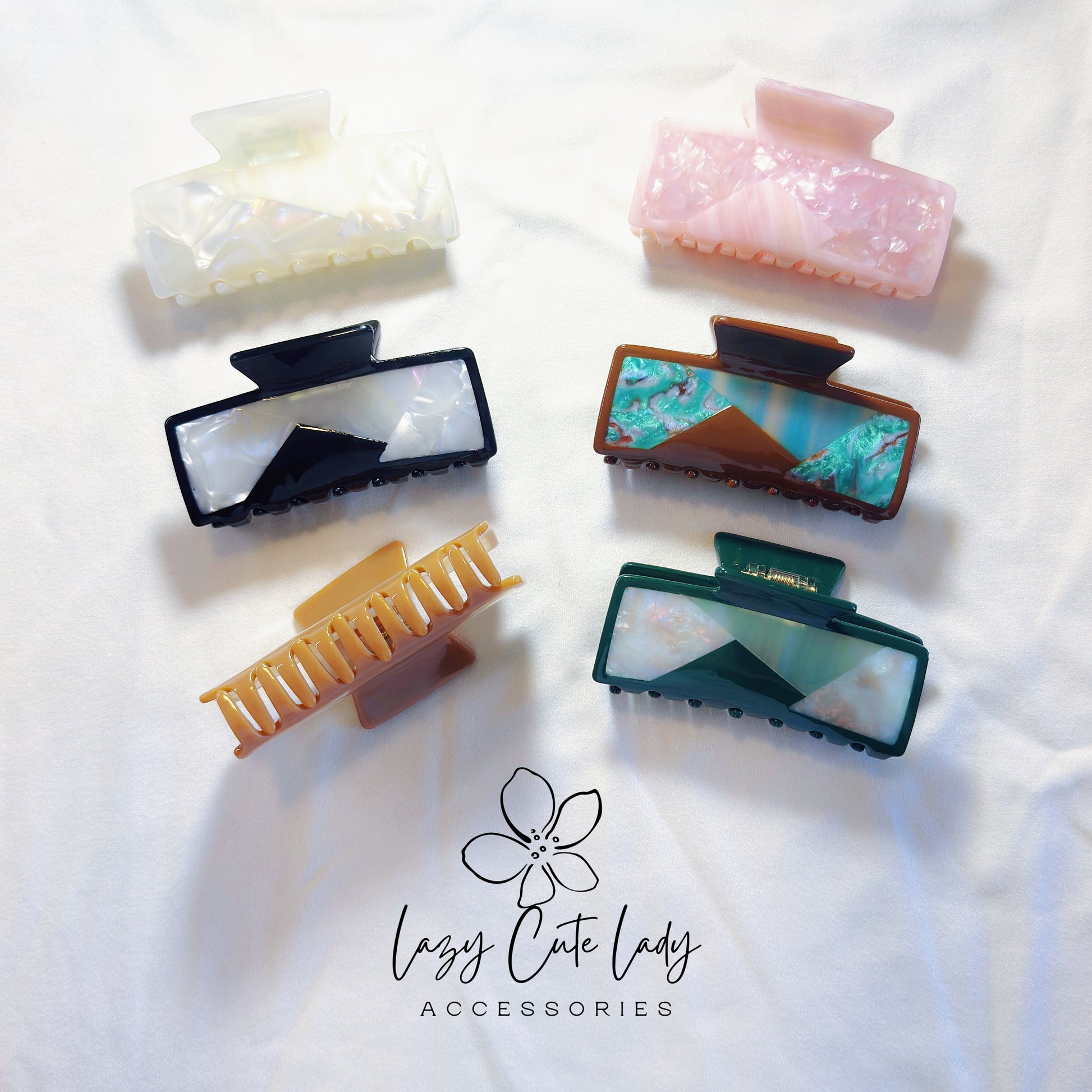 Made from eco-friendly acetate, these geometric colorblock hair claws are the perfect blend of sustainability and style. With a unique mosaic design and a sleek modern aesthetic, each clip is available in a range of chic colors—creamy ivory, blush pink, bold black, deep green, tortoiseshell, and ocean teal. The 3.5-inch size offers a secure grip, making it ideal for thick hair or elegant updos. Whether you're styling your hair for a casual day out, a special event, or just want to elevate your everyday look, these clips add a polished, fashion-forward touch. Suitable for all hair types and age groups, they also make a charming and practical gift for anyone who loves quality accessories with a unique twist.