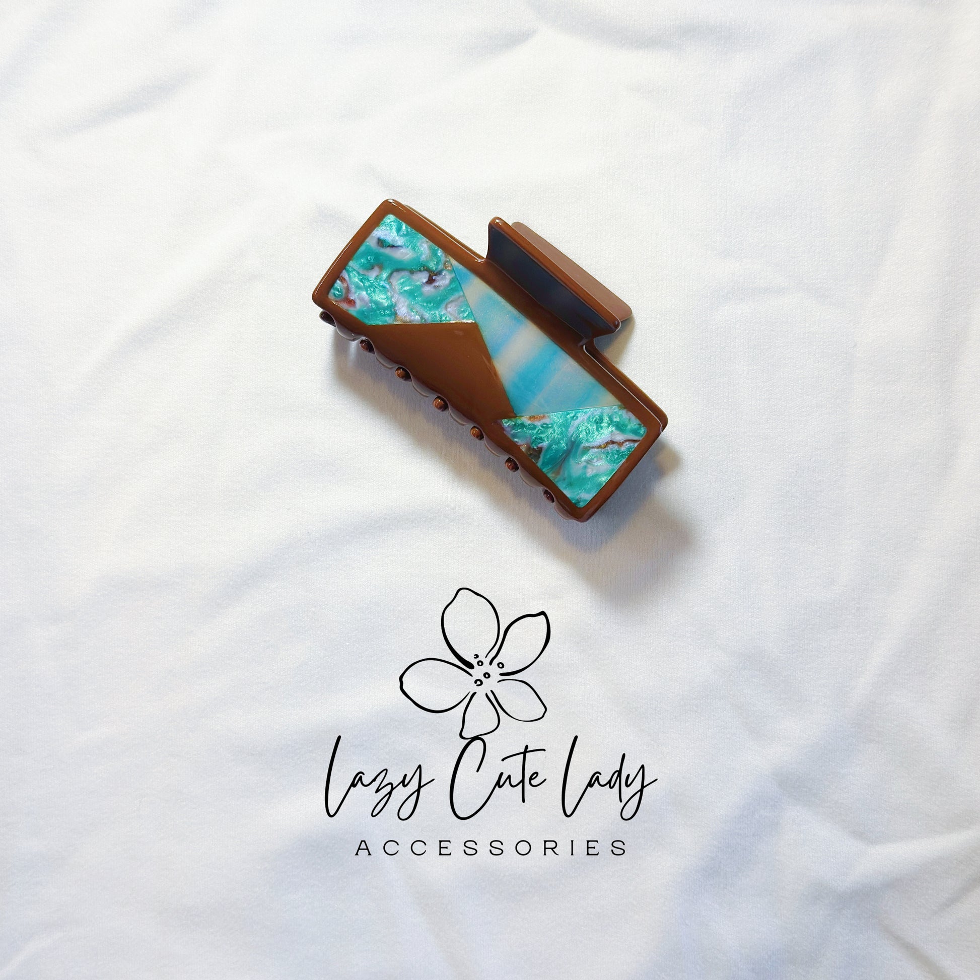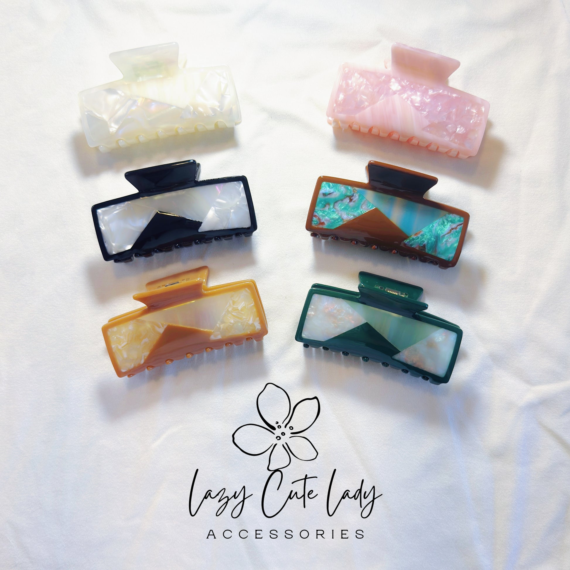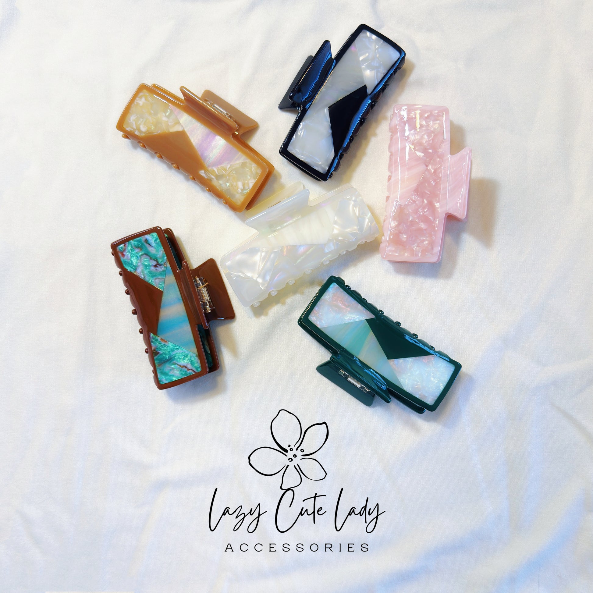 Made from eco-friendly acetate, these geometric colorblock hair claws are the perfect blend of sustainability and style. With a unique mosaic design and a sleek modern aesthetic, each clip is available in a range of chic colors—creamy ivory, blush pink, bold black, deep green, tortoiseshell, and ocean teal. The 3.5-inch size offers a secure grip, making it ideal for thick hair or elegant updos. Whether you're styling your hair for a casual day out, a special event, or just want to elevate your everyday look, these clips add a polished, fashion-forward touch. Suitable for all hair types and age groups, they also make a charming and practical gift for anyone who loves quality accessories with a unique twist.