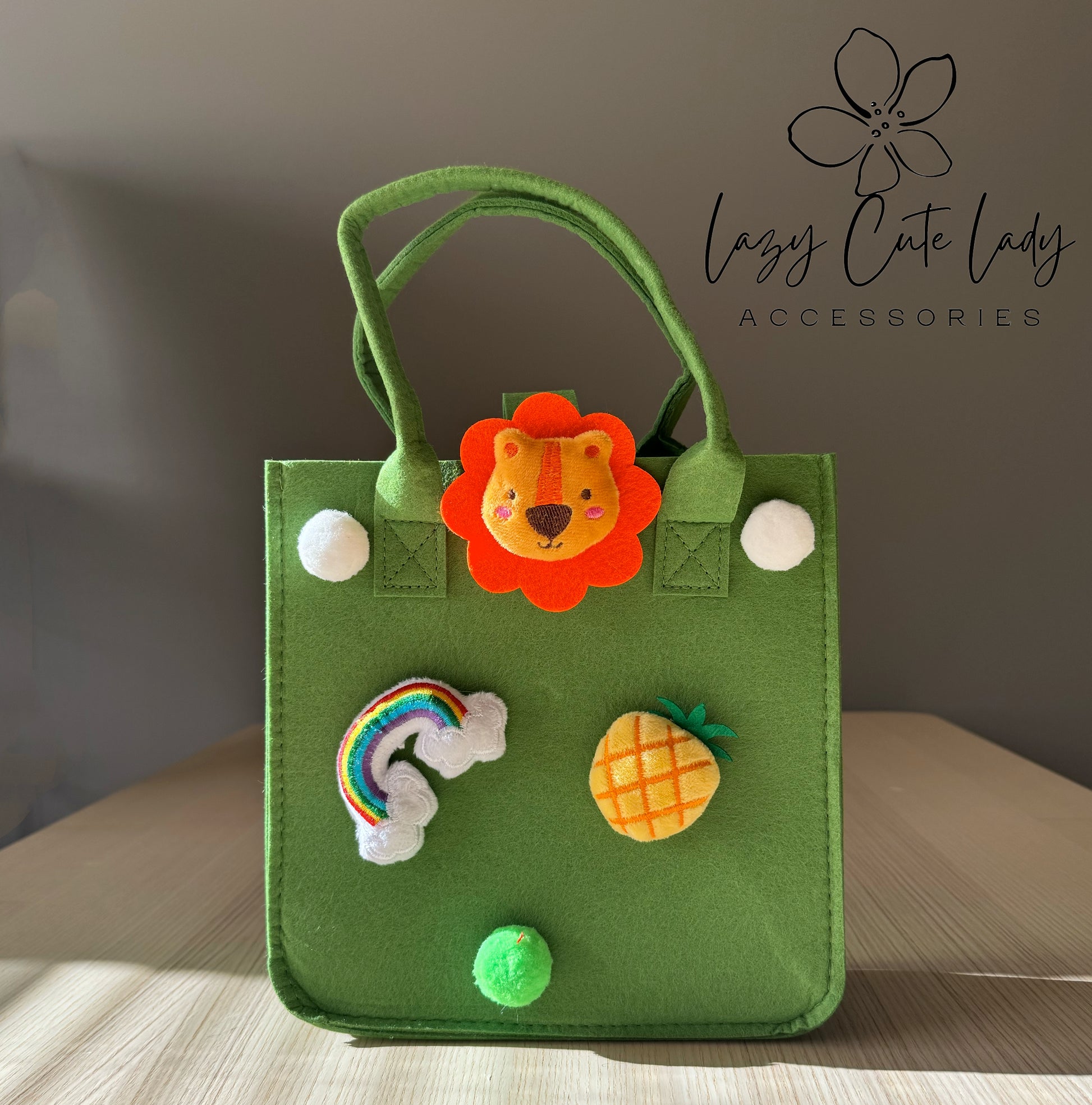 Brighten your day with our handmade felt lion tote bag! This rectangular tote is as practical as it is playful, featuring colorful felt balls, a charming lion, a pineapple, and a rainbow plush charm. Choose from six vibrant colors to match your style: