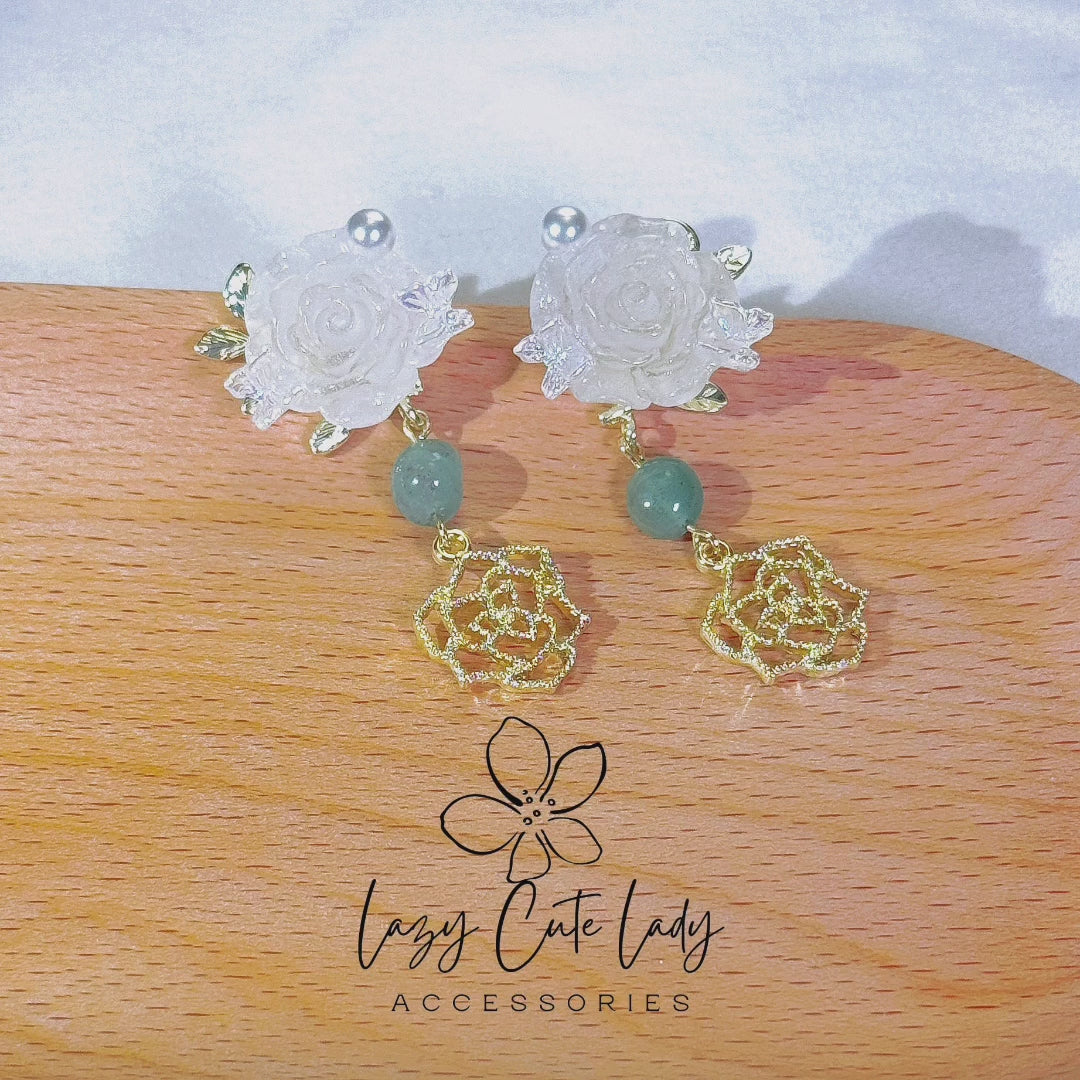 Lazy Cute Lady Accessories-Jade Rose Symphony: Quartz, Metal, and Jade Floral Earrings with Butterfly and Pearl Accents Cute Earrings- Gift - for girl for women