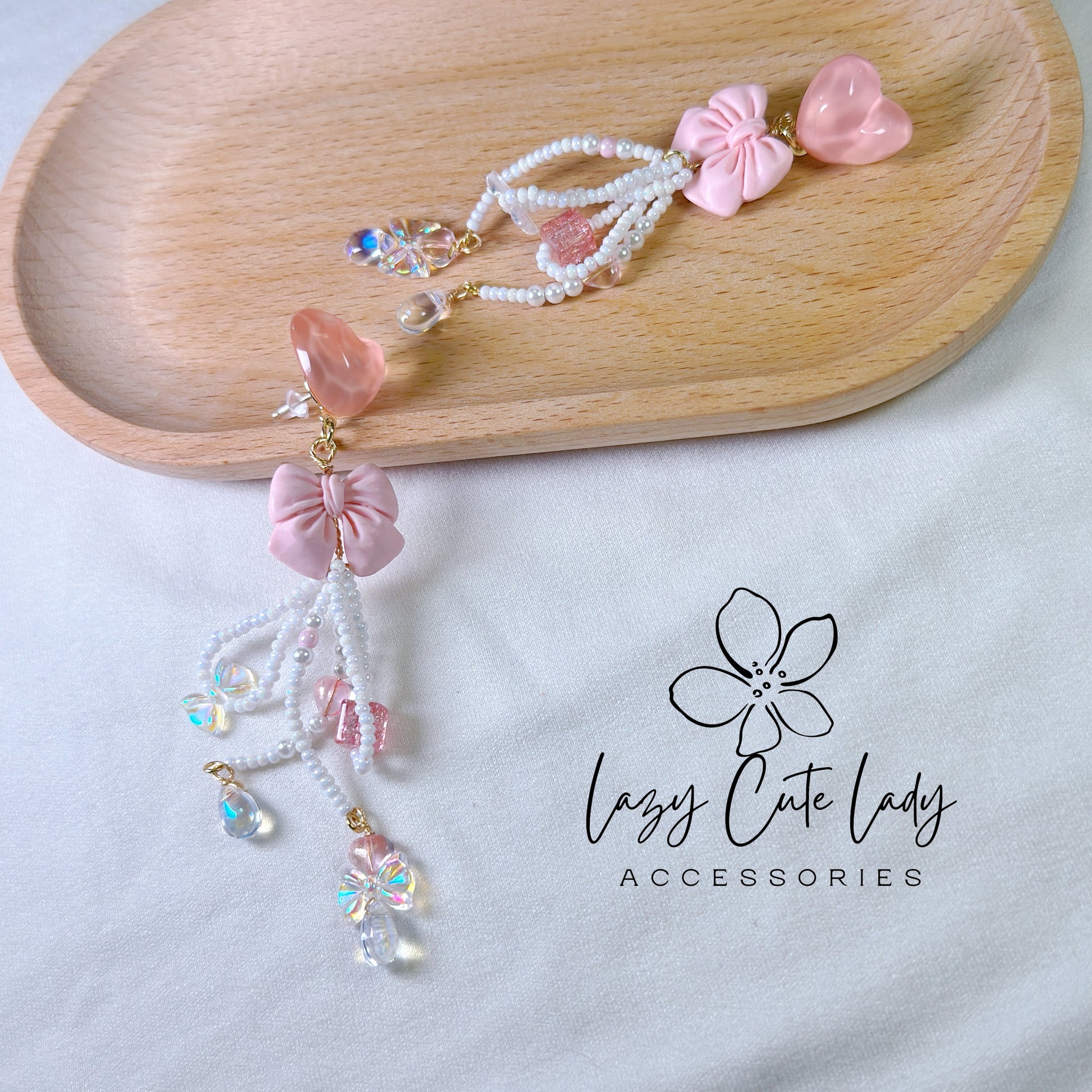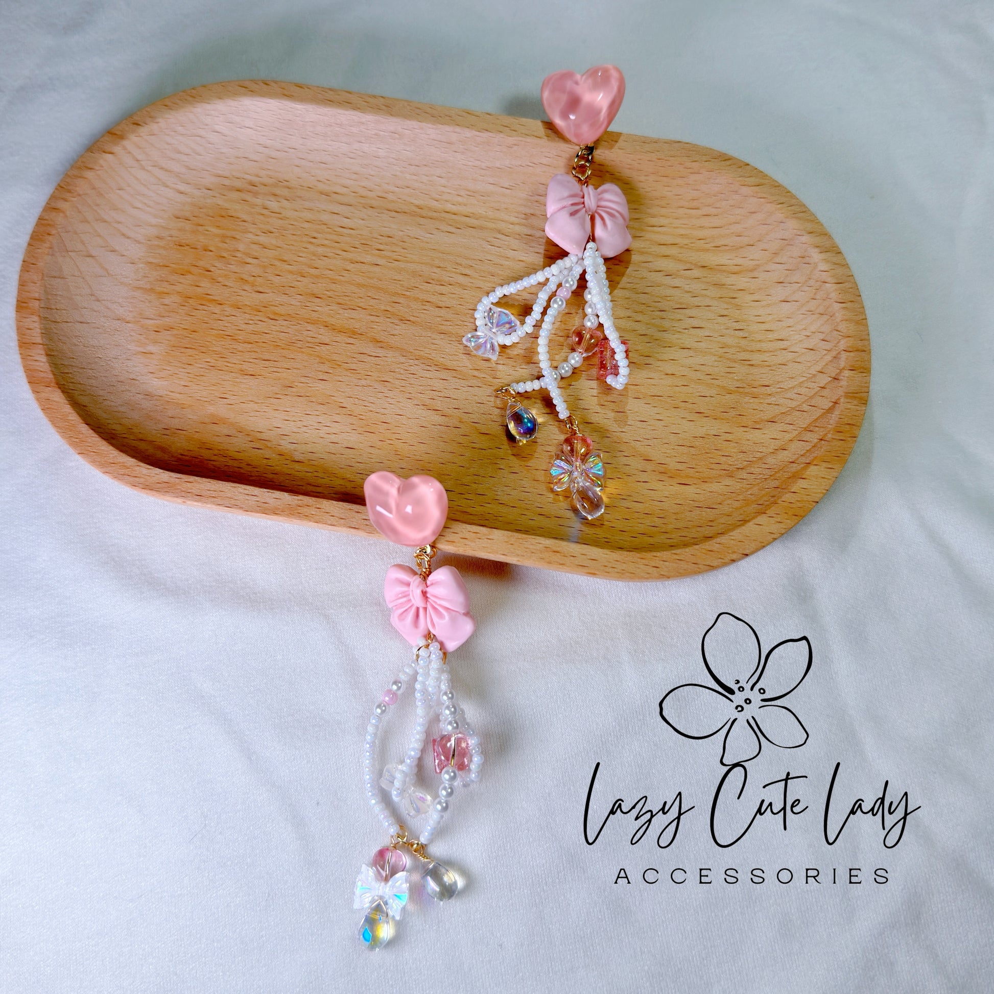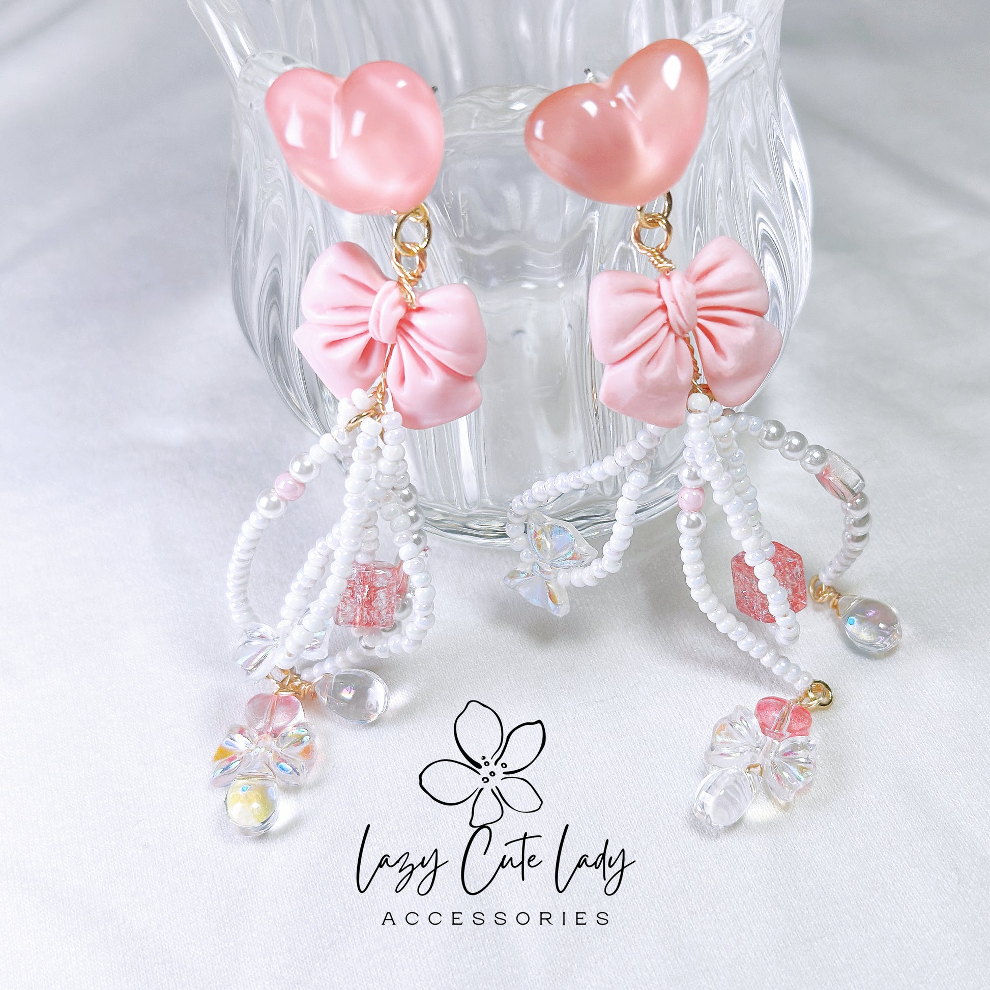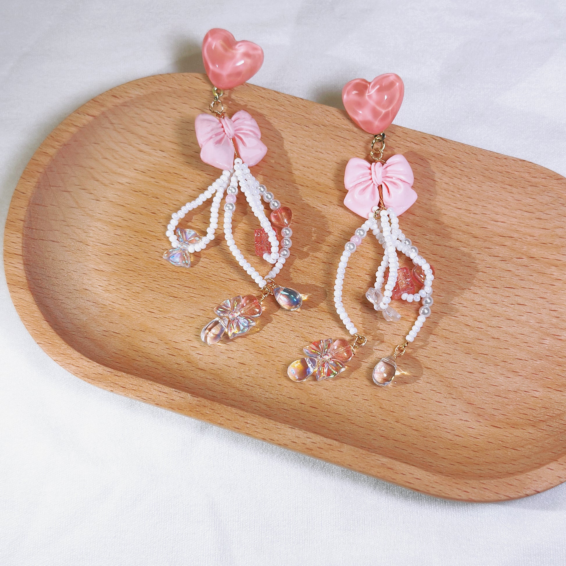 Pink Love Delight: Handcrafted Heart and Bow Earrings with Creative Bead Accents