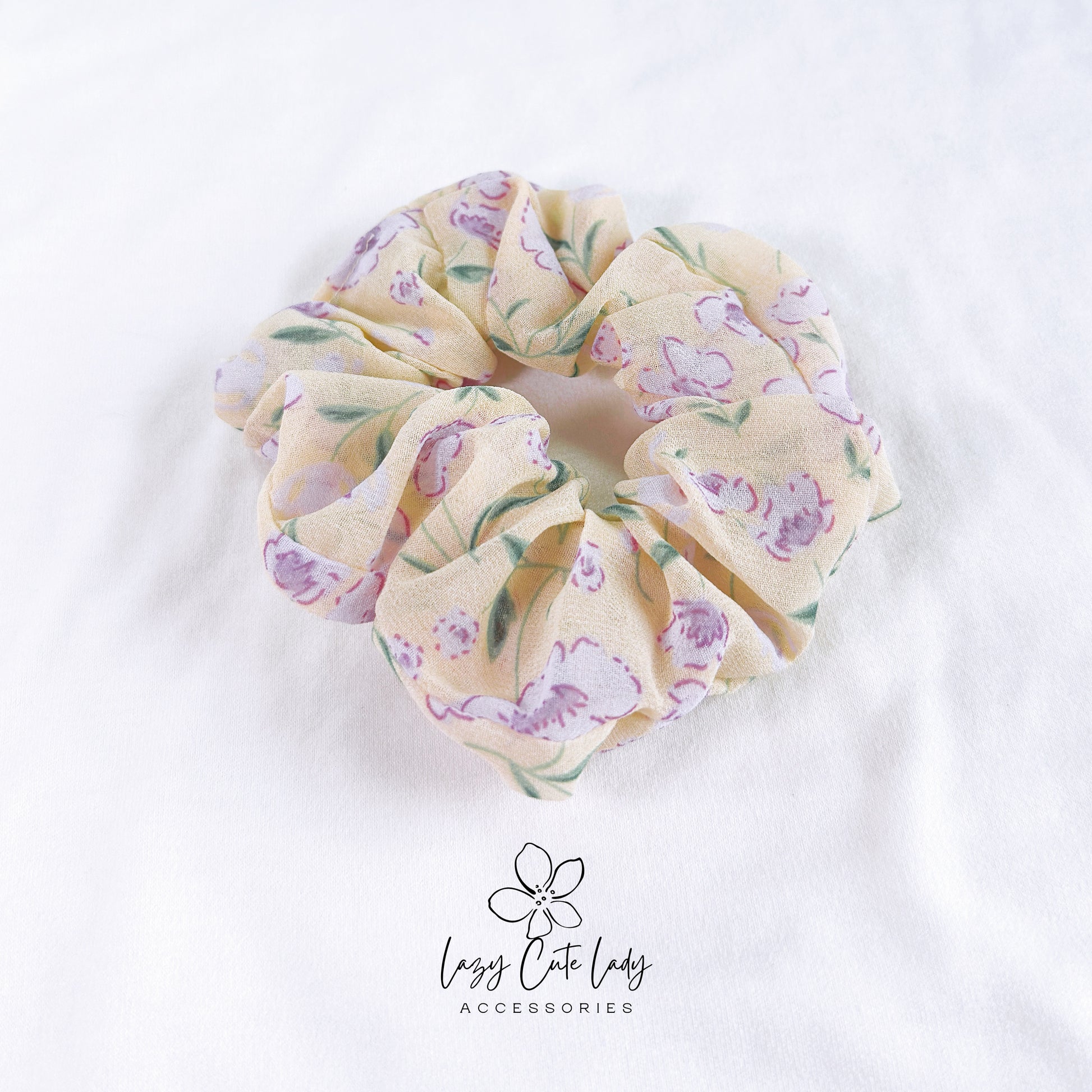 Elevate your hairstyle with our Lilac Blossom Delight Hair Scrunchies. These adorable and elegant scrunchies capture the essence of a fresh and charming lilac floral pattern against a vibrant yellow backdrop: