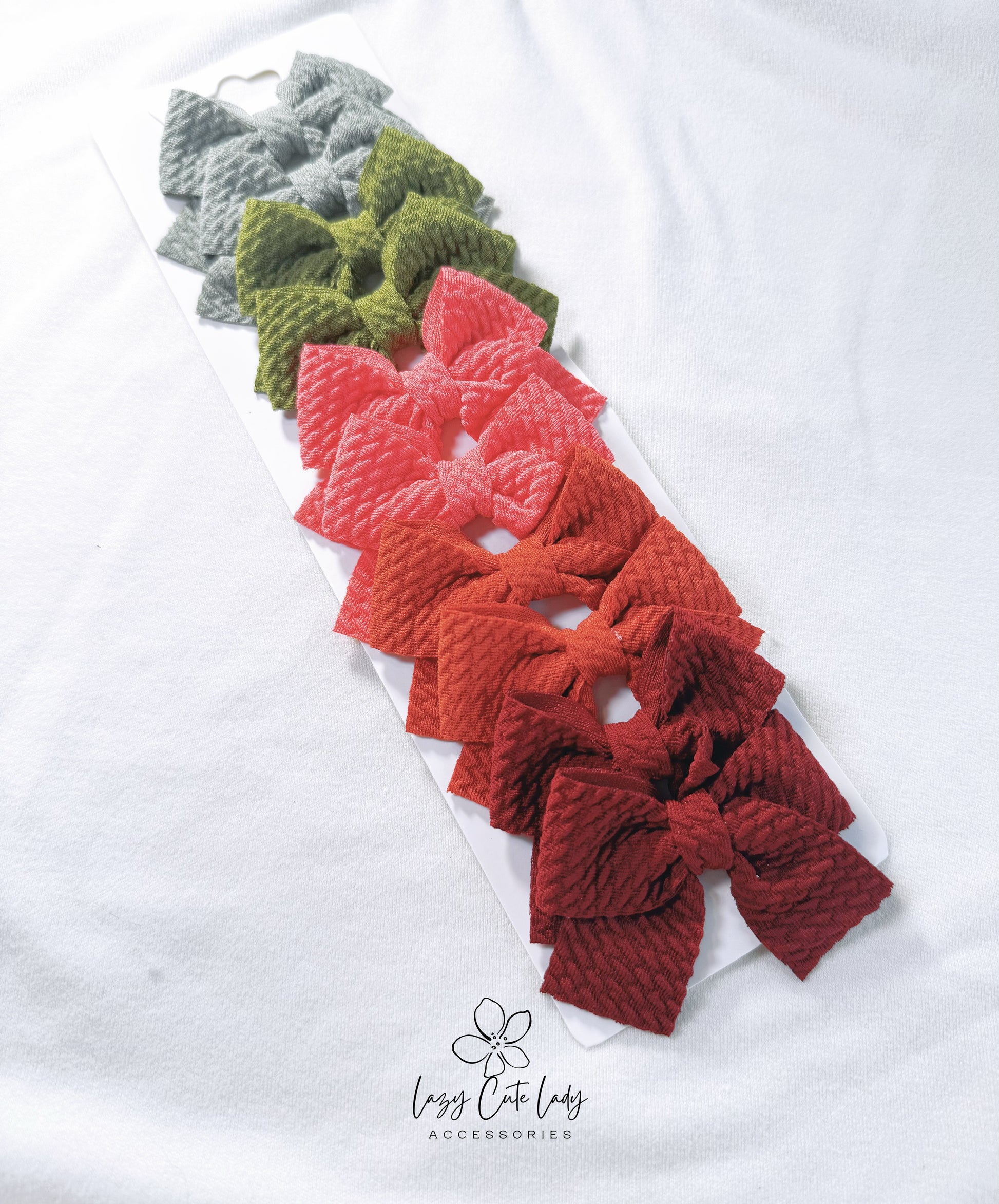 Introducing our Mini Bow Hair Clips Set, a collection of adorable hair clips perfect for both adults and little ones. With a variety of colors and combinations available, you can mix and match to your heart's content. These mini-sized clips are not only practical but also incredibly cute, adding a touch of charm to any hairstyle.