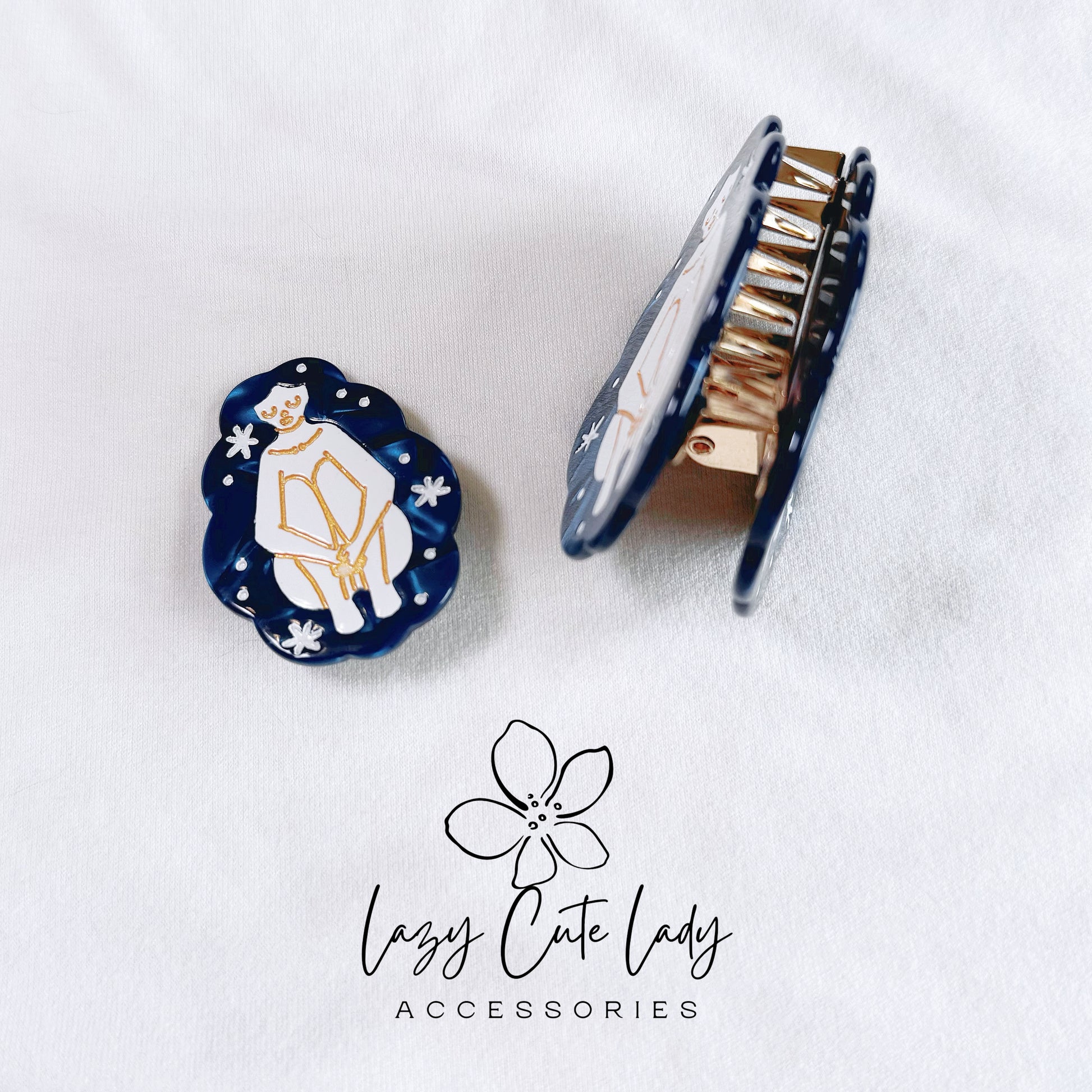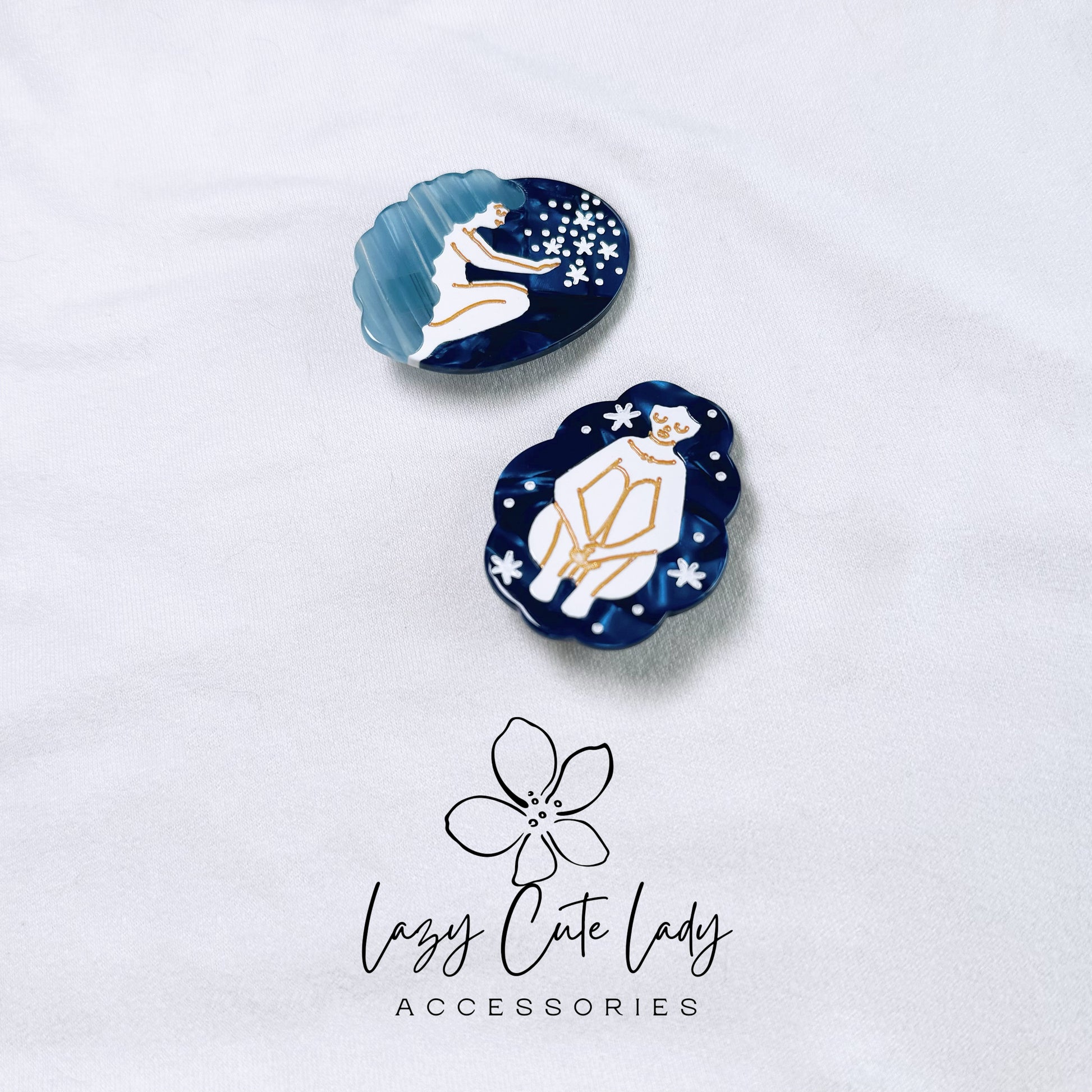 Discover the Ocean and Stars Collection, an eco-friendly hair accessory series crafted from sustainable acetate material. This artistic collection features hair clips and claws with beautiful designs inspired by the ocean and starry skies. Choose from two hair clip designs: a girl hugging her knees under the stars or a girl reaching for the stars. The hair claws come in three captivating designs: a girl hugging her knees under the stars, a girl reaching for the stars, and a mermaid. Each piece is artistically crafted to add a touch of elegance and whimsy to any hairstyle.