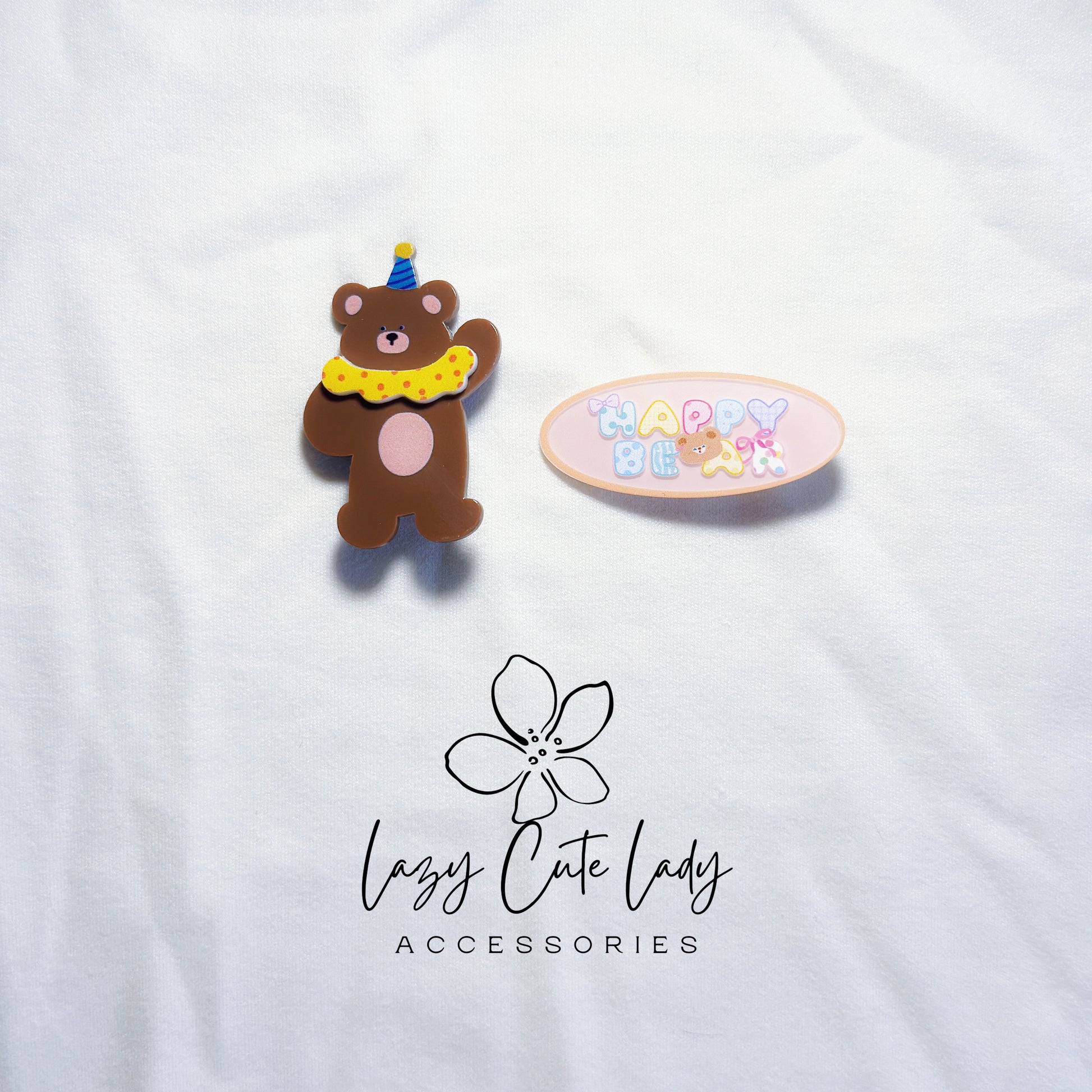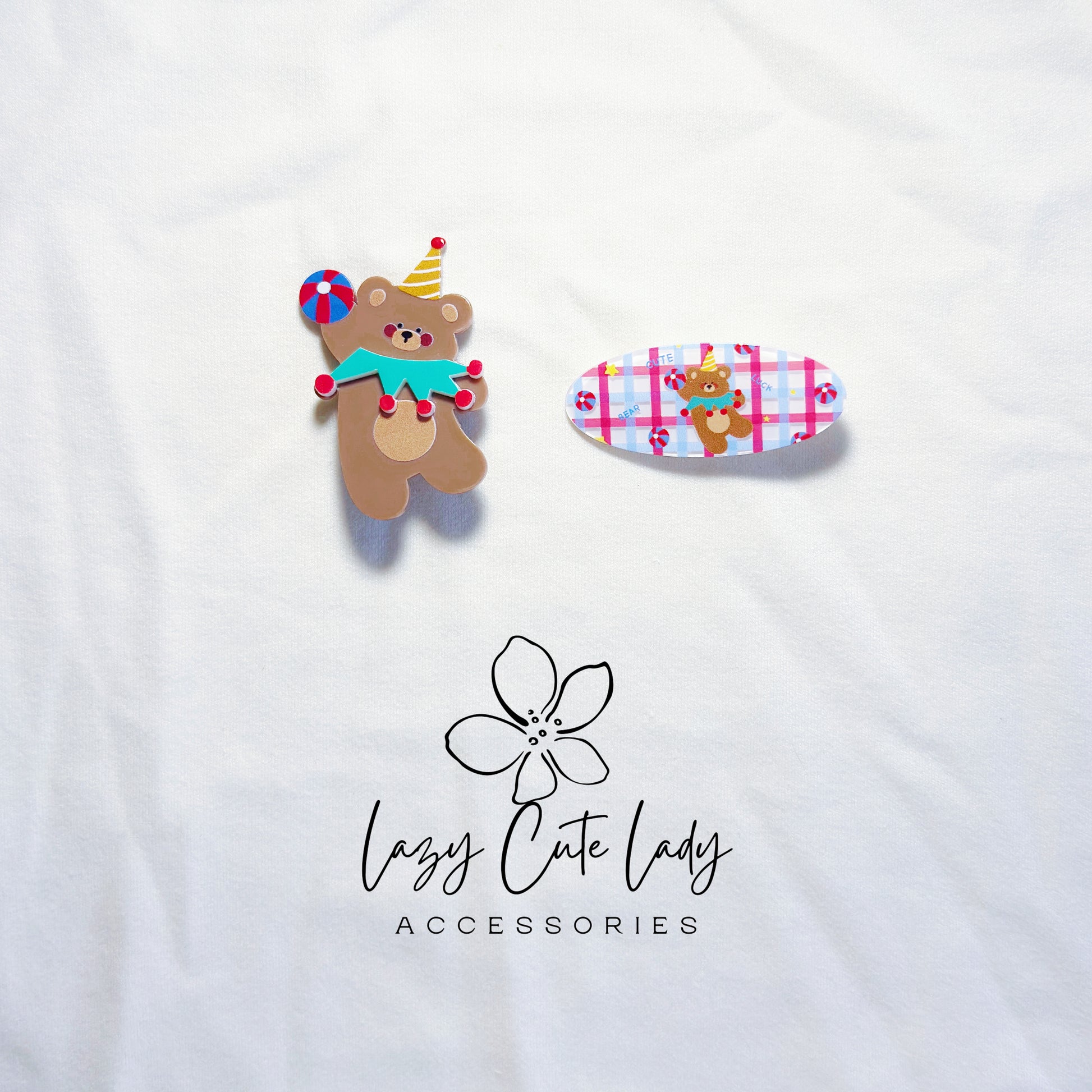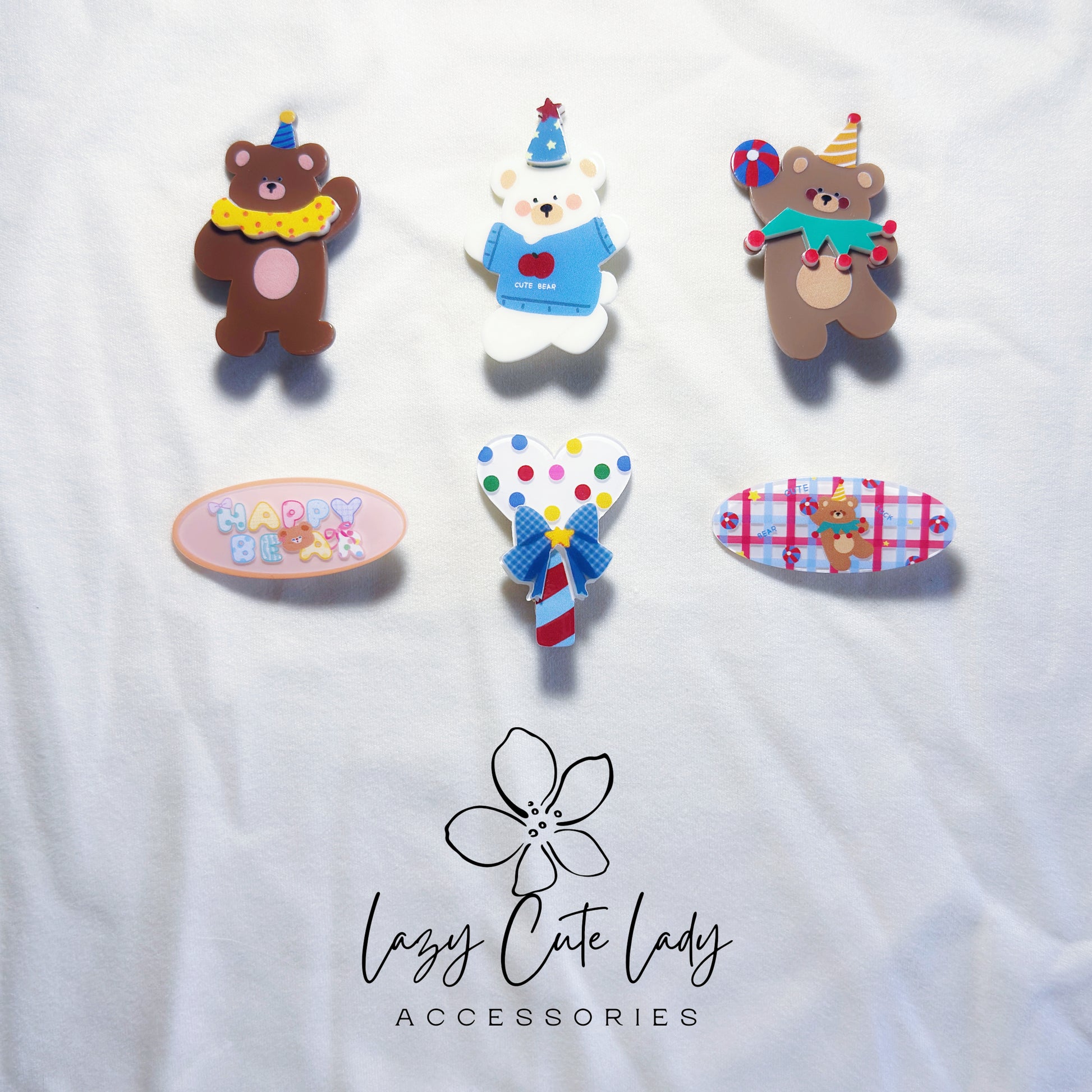 These adorable clips feature playful bears in party hats, colorful hearts, and sweet prints — perfect for adding a cheerful, whimsical touch to any hairstyle.