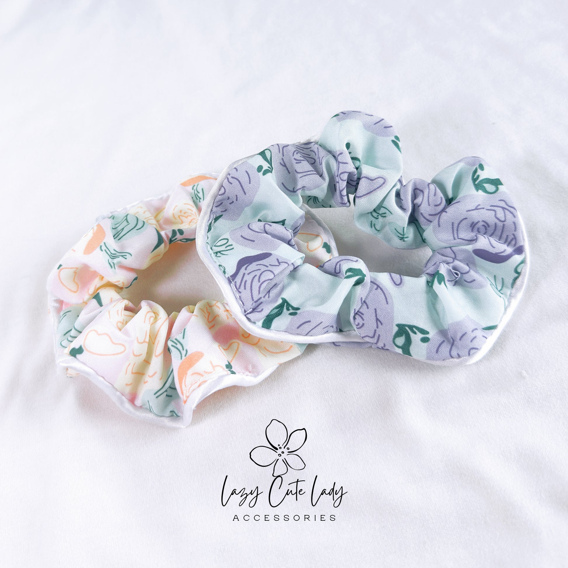 Indulge in the charm and luxury of these silk floral-themed hair scrunchies—a perfect blend of cuteness, elegance, and sophistication for a refined look.