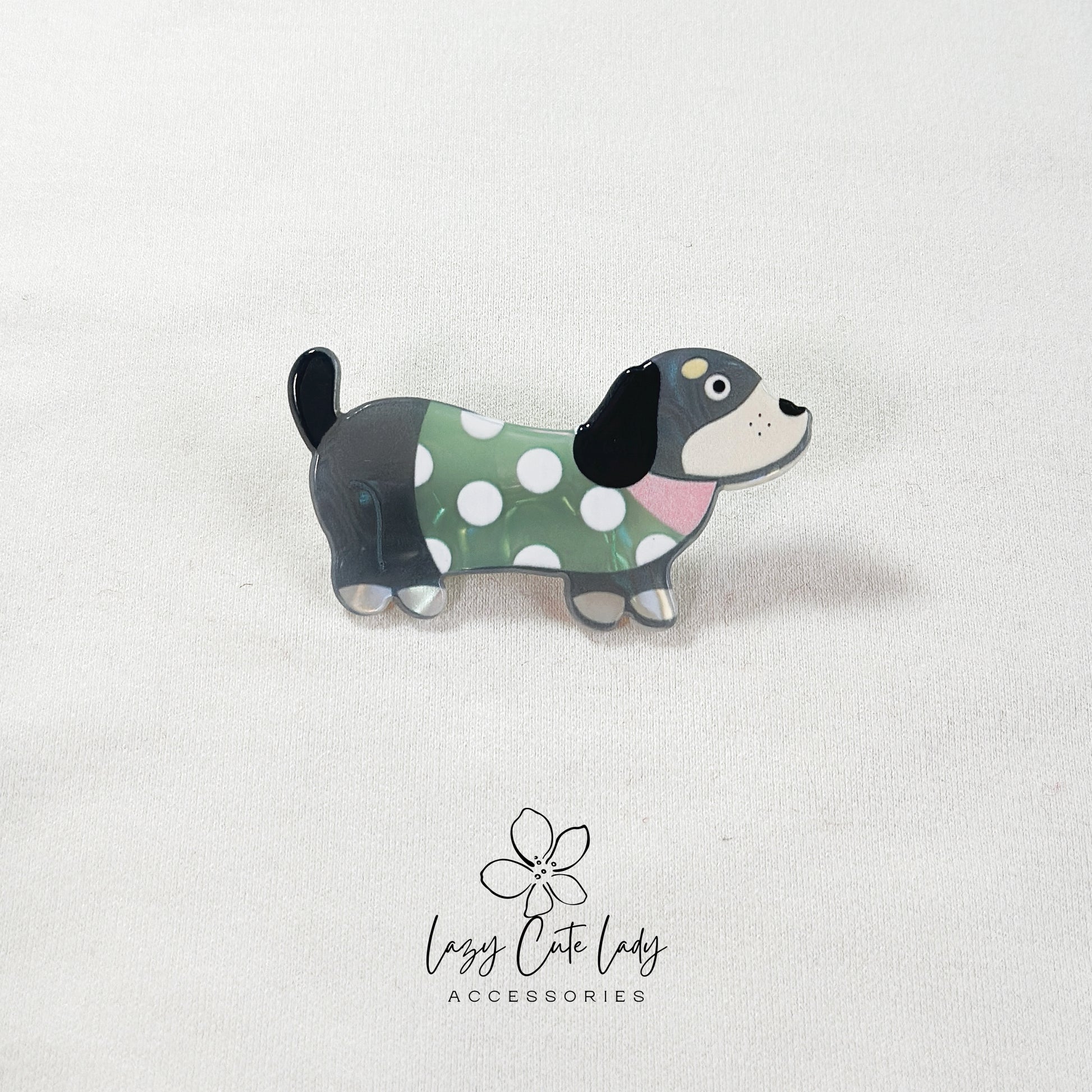 Charming Spotted Pup Design: The hair clip showcases an endearing puppy in spotted clothing, creating a playful and fashionable accessory.