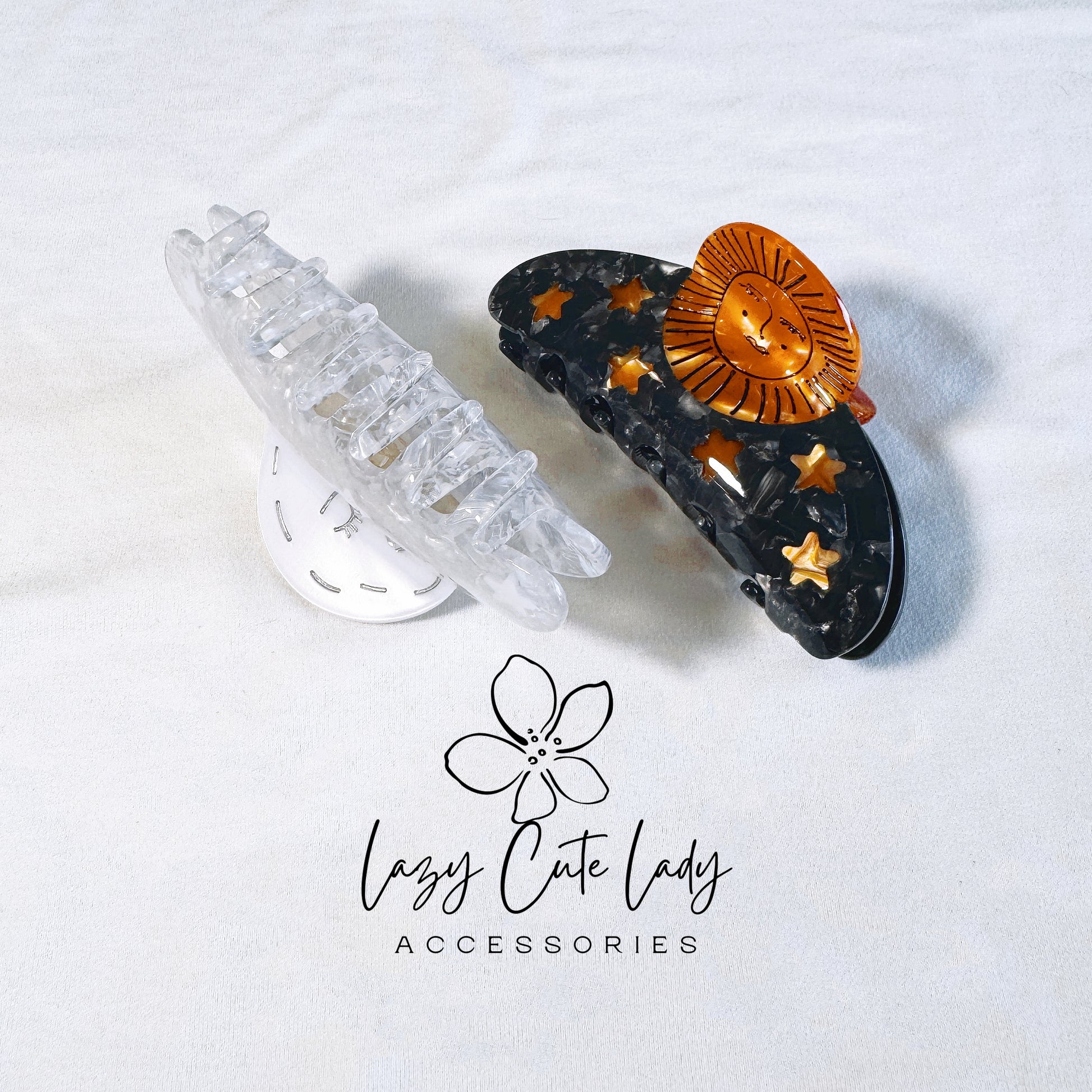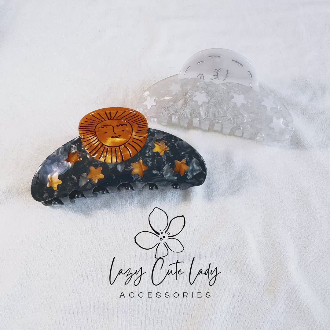 Infuse your style with celestial elegance using our Sun God & Moon Goddess Inspired Hair Claws. Crafted from eco-friendly acetate, these artistic and intricately designed hair claws are a true statement piece. The Sun God claw features a luxurious gold and black color scheme, offering a bold and distinctive look. The Moon Goddess claw combines silver and white for a refined, graceful appearance. Perfect for securing even thick hair, these hair claws complement any hairstyle and are ideal for both casual and formal settings. Suitable for all ages, they make a sophisticated gift choice.