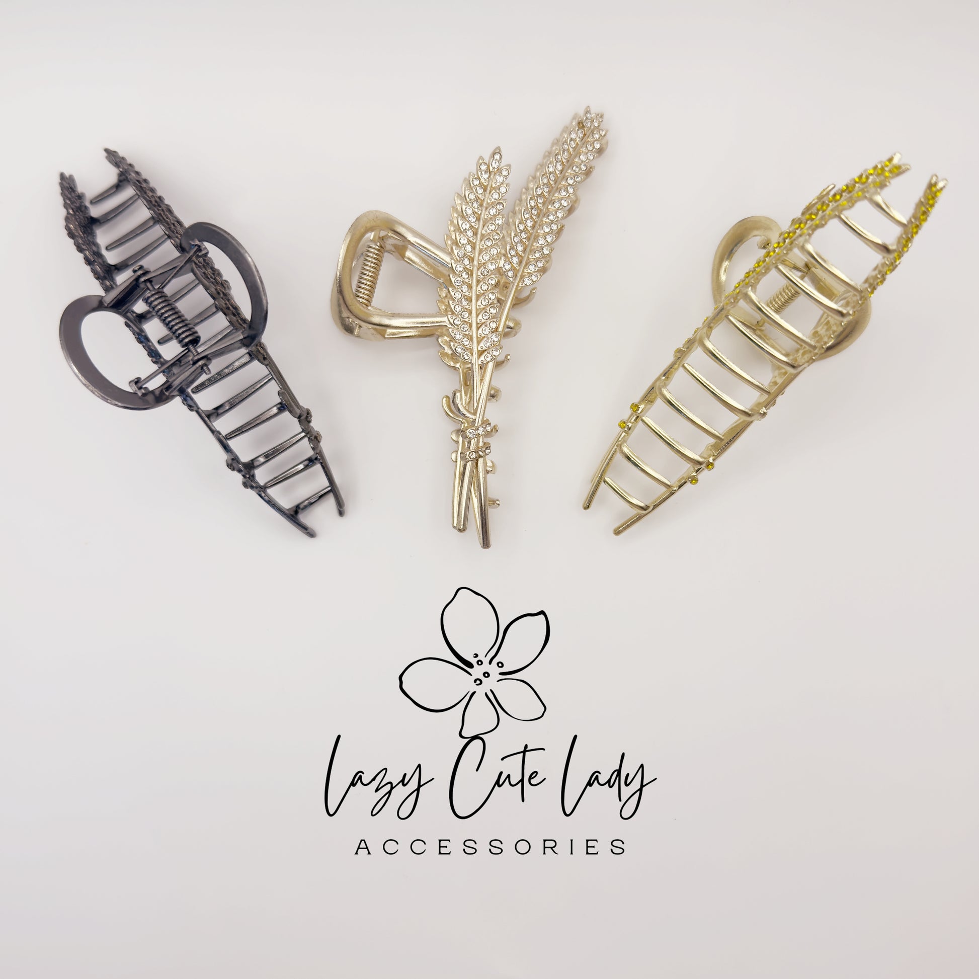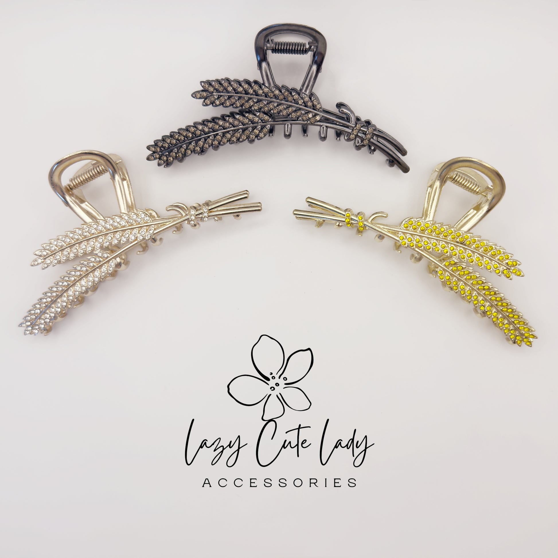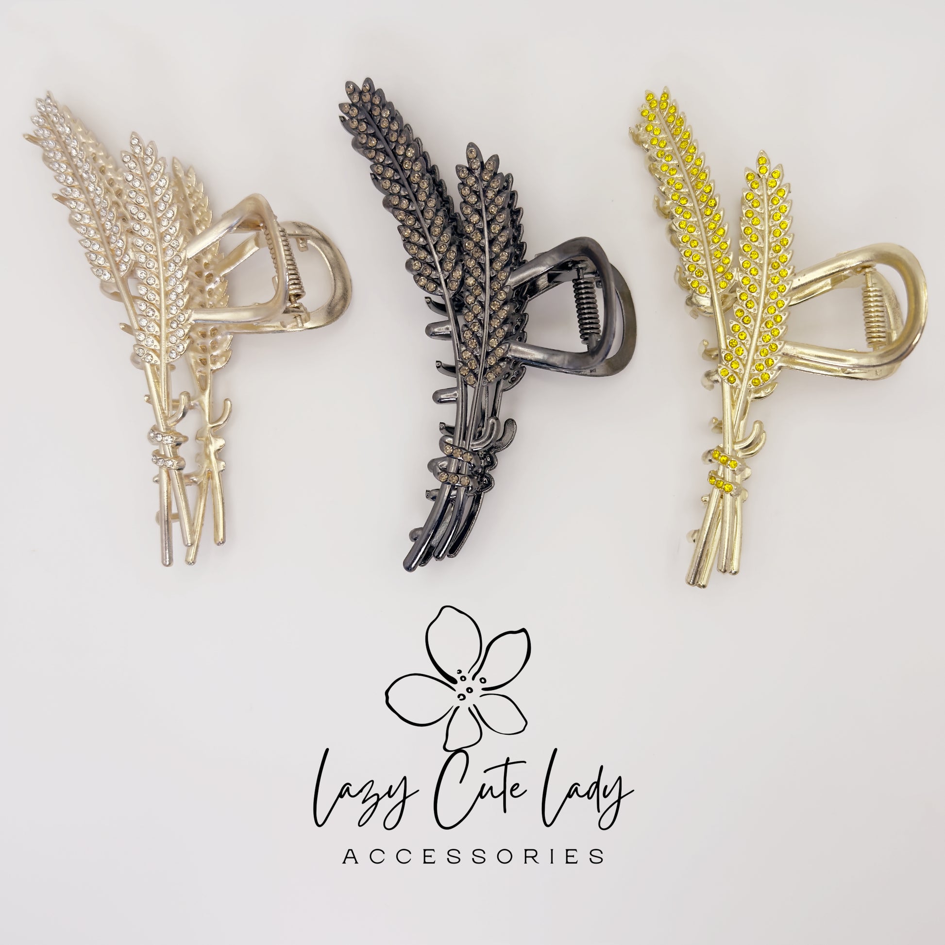 ✨ Bring natural elegance to your hairstyle with these wheat-inspired hair claws. Crafted from durable alloy metal and adorned with rhinestones, these clips combine strength with sophistication. Available in three colors, they are perfect for weddings, parties, or elevating everyday outfits.