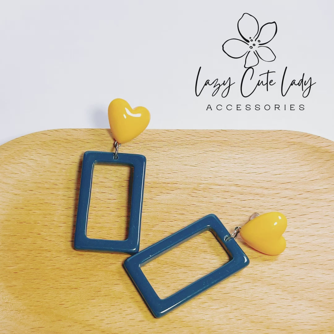 Yellow Heart and Navy Rectangle Geometric Drop Earrings